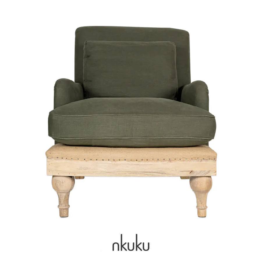 One of the iconic and bestsellers pieces of Nkuku. With a ligth tone mango wood frame and upholstered in a soft green olive linen, this deconstructed-design armchair is a one of a kind chair for your living areas.