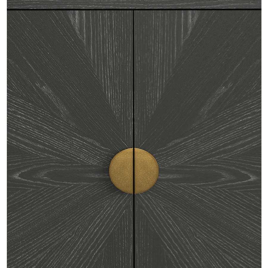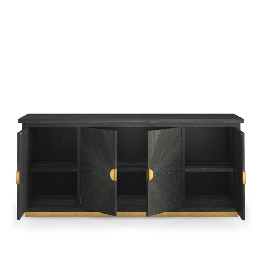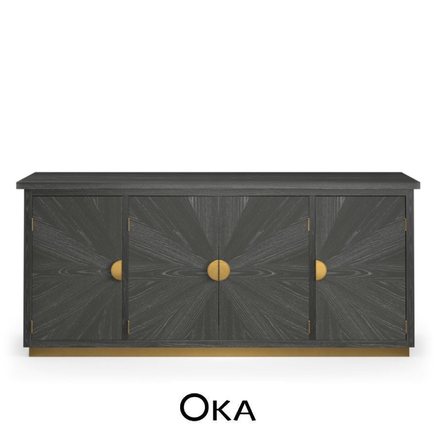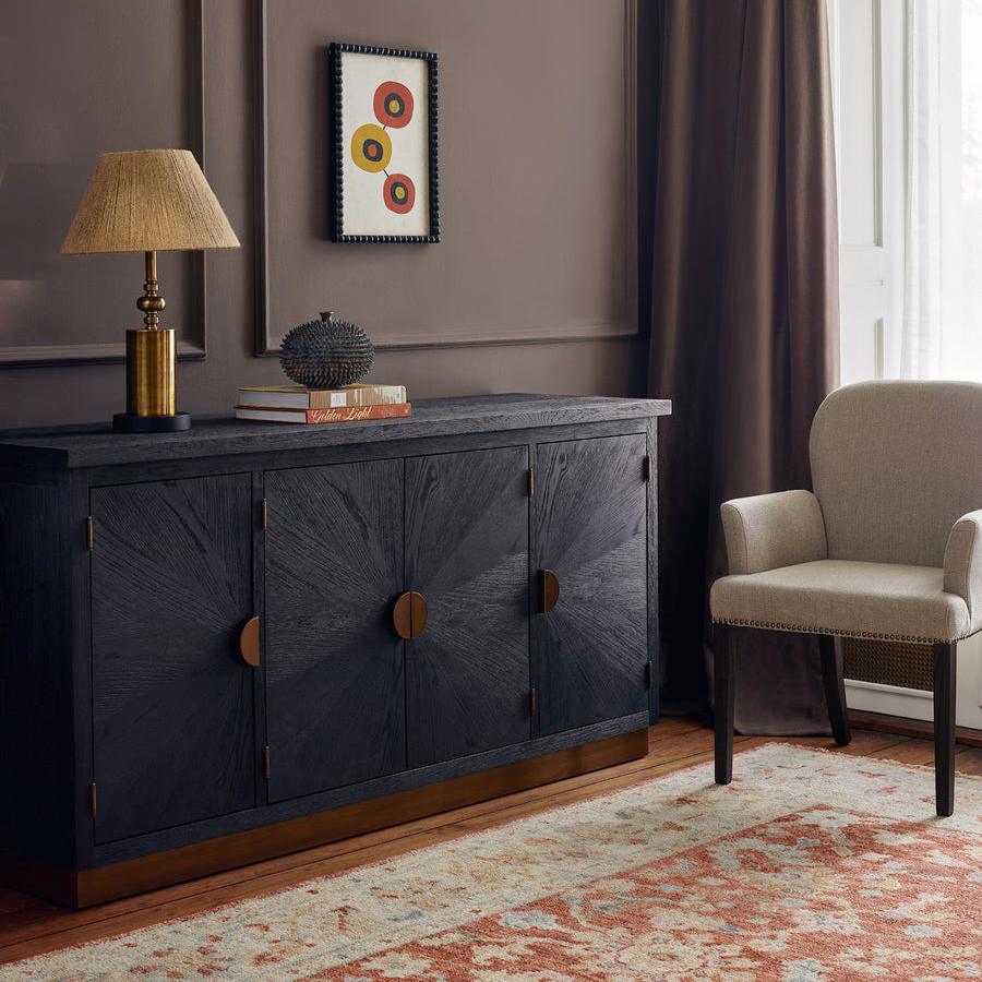 Stylish sideboard hand-painted in black oak with a rich, reflective grain, mounted on a sleek brass plinth and accented by half-moon brass handles to evoke a star-lit facade. A bold, sculptural storage piece that defines elegance and modern glamour.
