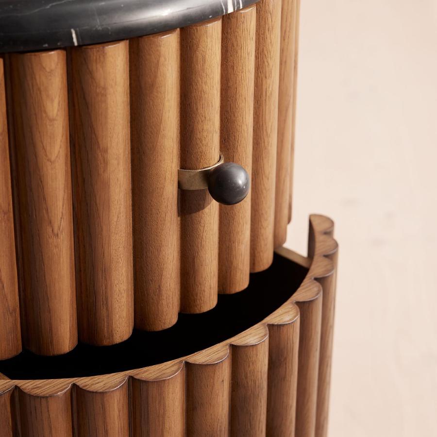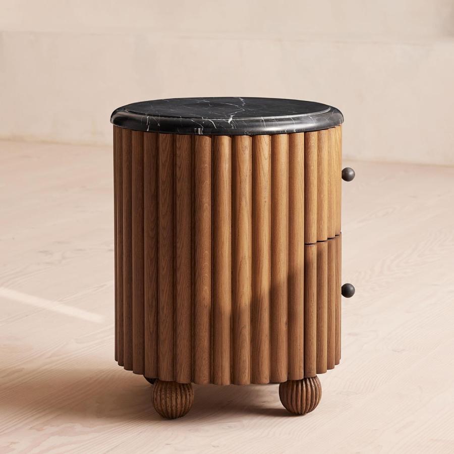 Elegant bedside table with a sleek black marble top and minimalist frame, blending elegance with durability. Its refined design, combining stone and clean lines, adds sophistication to any bedroom. Perfect for a modern or luxe decor, offering both function and style as a timeless nightstand.
