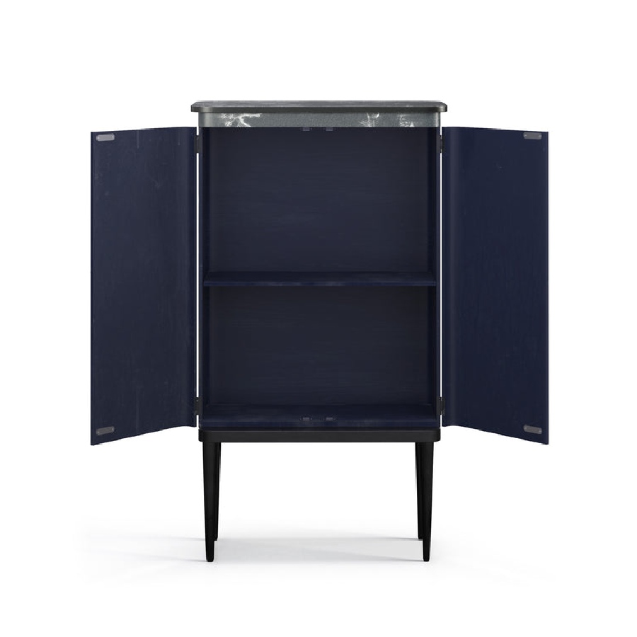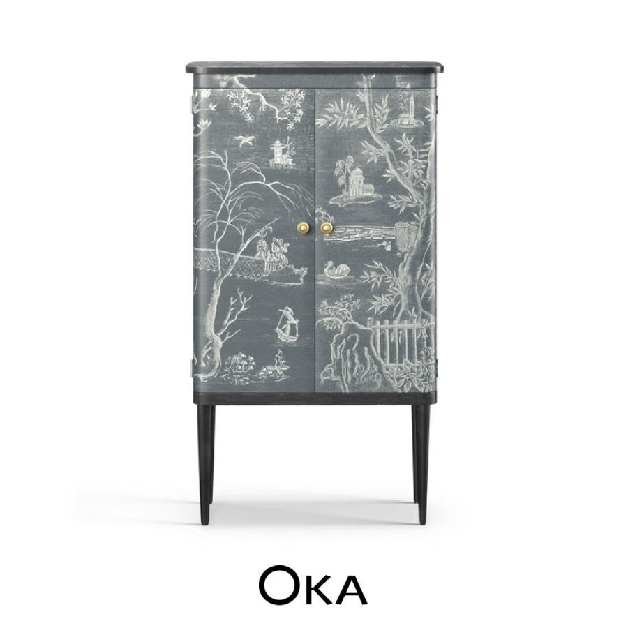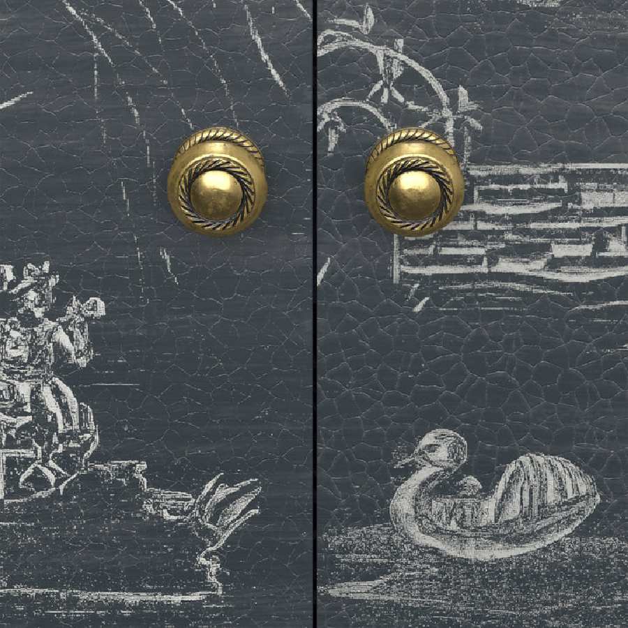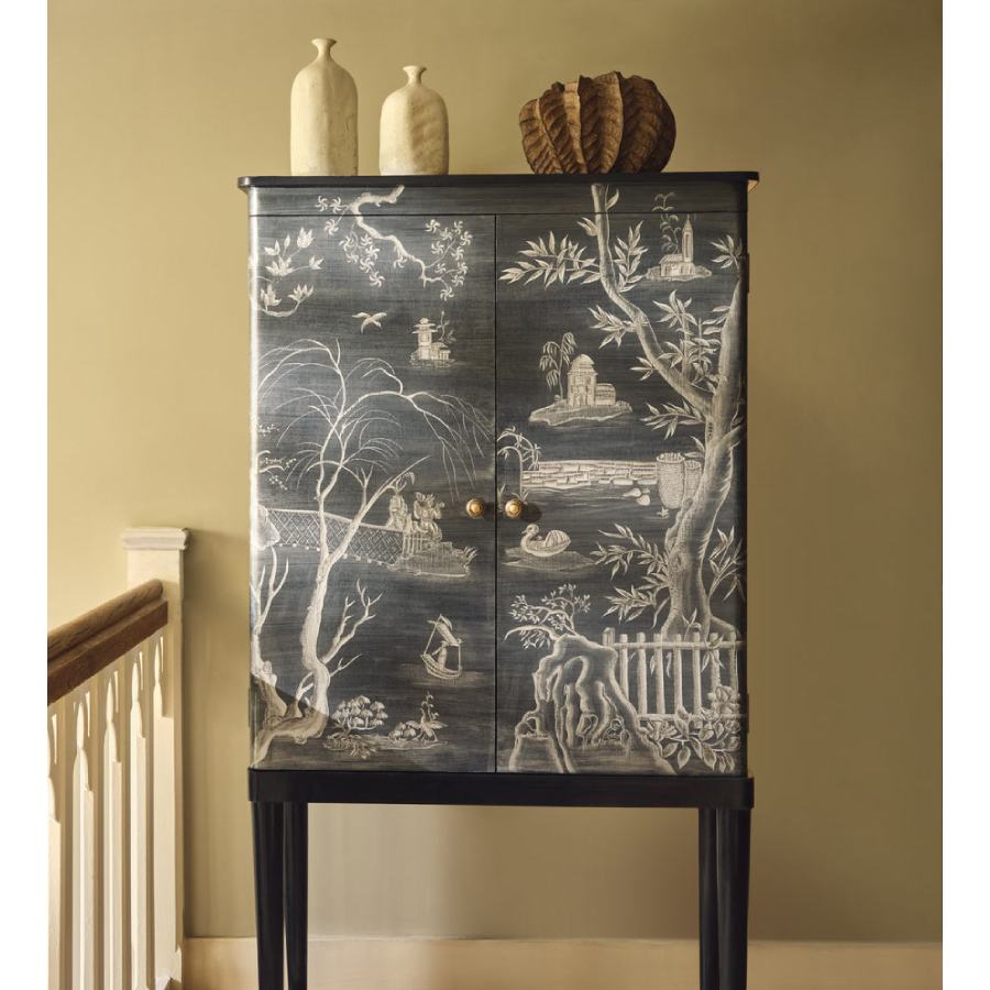 Enhance your home with this beautifully hand-painted cabinet featuring silver-leaf chinoiserie patterns set against a rich petrol lacquer finish. It offers both adjustable shelving and glass-hanging racks. Make a bold, artistic statement while organizing your wine collection or your stunning homeware with enduring elegance.