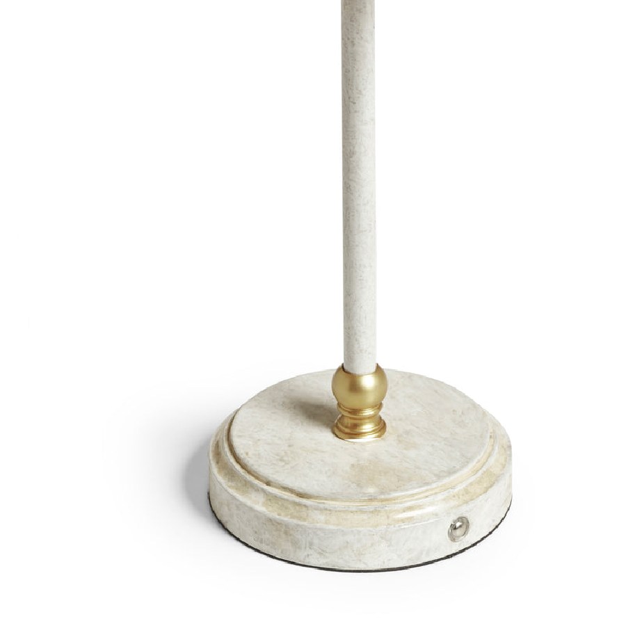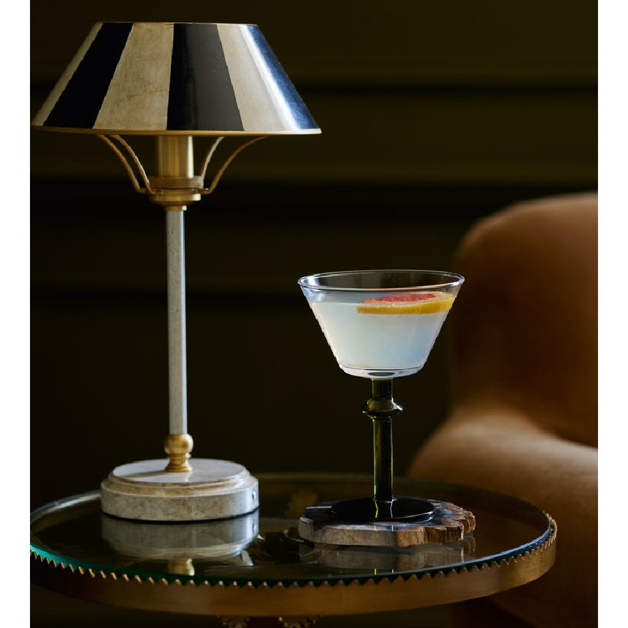 A wireless twist on a classic OKA lamp that fuses vintage flair and modern convenience. With its hand-painted blue-and-vellum striped metal shade, brushed-brass hardware, and 18-hour rechargeable battery with touch dimmer, it brings effortless charm and portable glow to any space. It features a rechargeable 18-hour life battery.