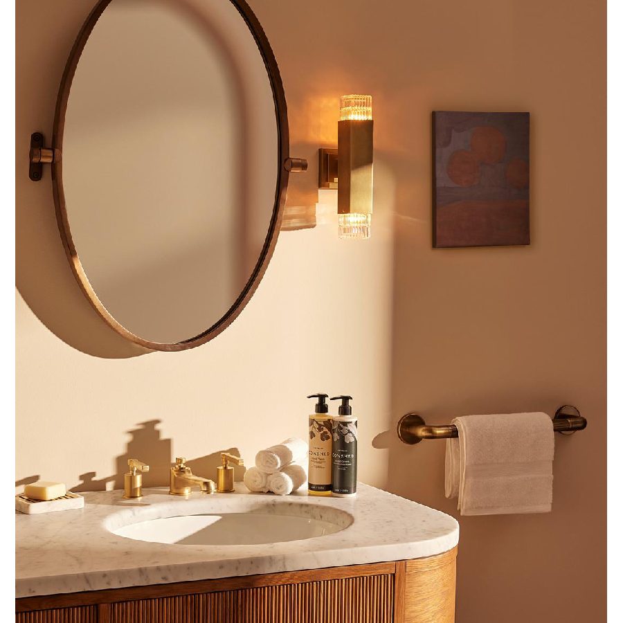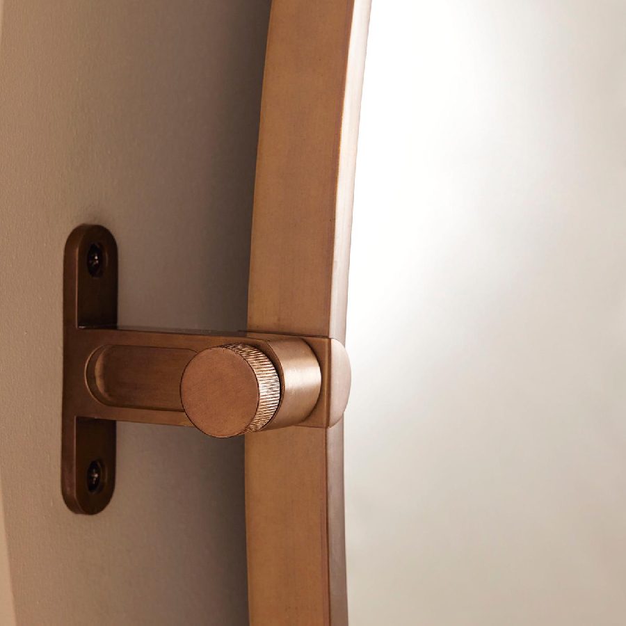 Add a striking focal point with this gently antiqued brass-finish wall mirror with elegant ribbed hinges and an adjustable tilt design. Its refined oval silhouette brings timeless character to your space, whether in a hallway, bathroom or living area.