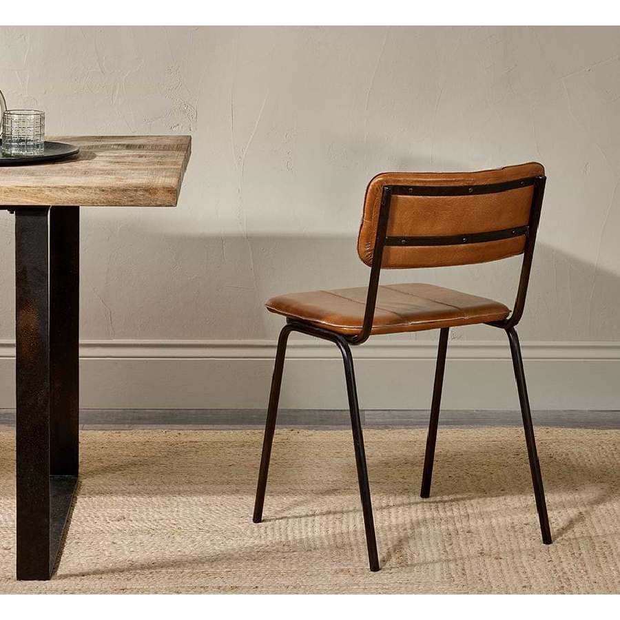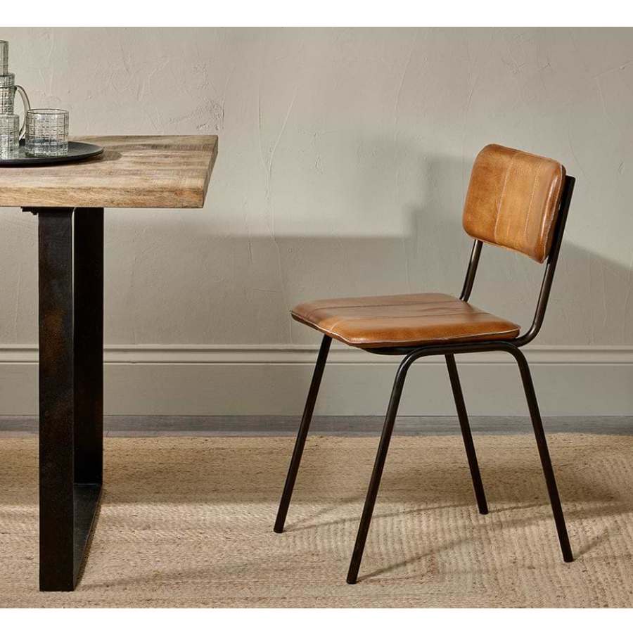 An stylish chair that blends rustic charm with industrial edge. Handcrafted from aged buffalo leather, dyed using vegetable extracts and tree bark, and set on a sleek iron frame, it offers lasting comfort and timeless style. Its seat and backrest are padded and adorned with subtle stitching details. Each piece is unique, with natural variations that age beautifully—perfect for adding warmth and character to any dining space.