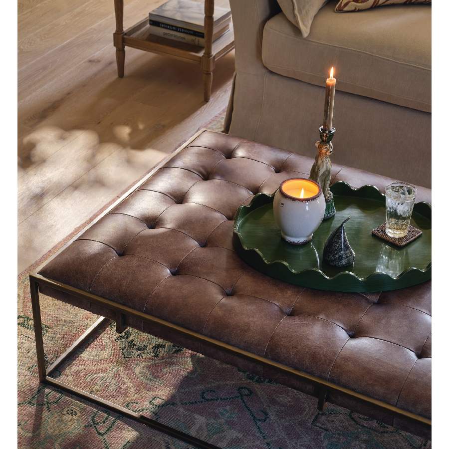 Discover this elegant handcrafted ottoman that blends angular brass framing with a tufted seat upholstered in aged leather. Perfect as a focal point or extra seating in your living room, it brings character and sophistication, and doubles beautifully as a coffee table. Its leather gains rich patina over time.