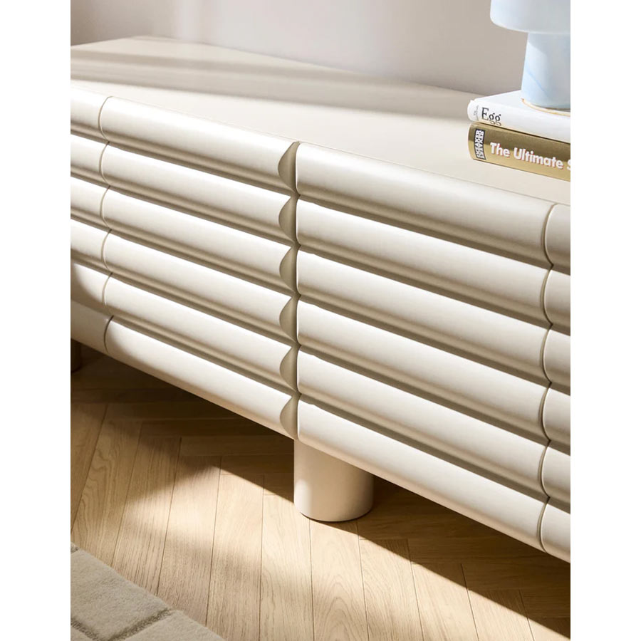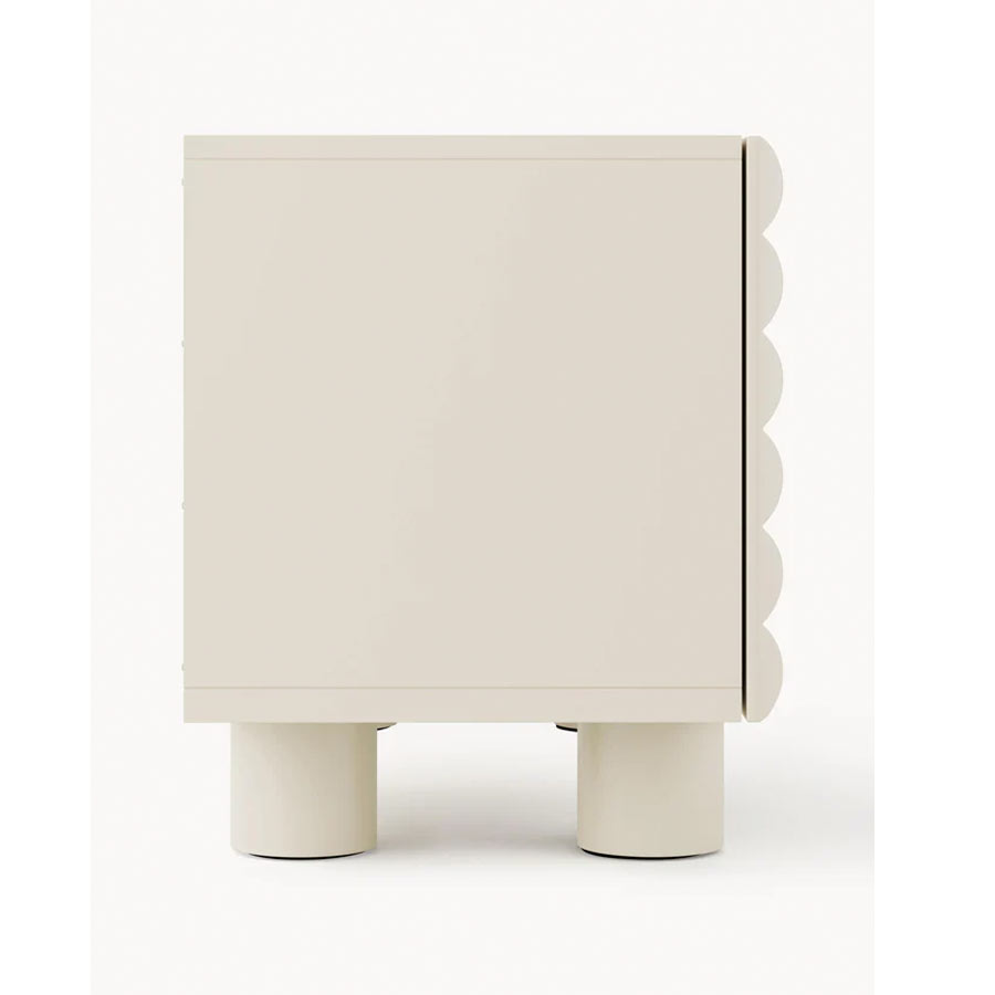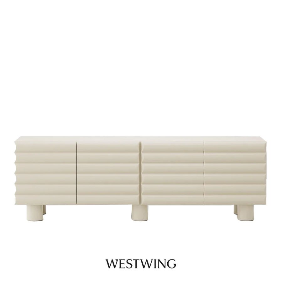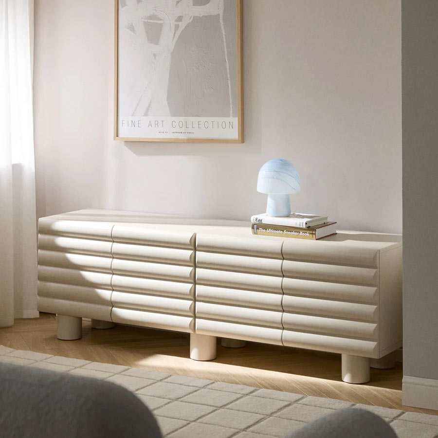 Élégant et original buffet beige à quatre portes et à la façade incurvée.