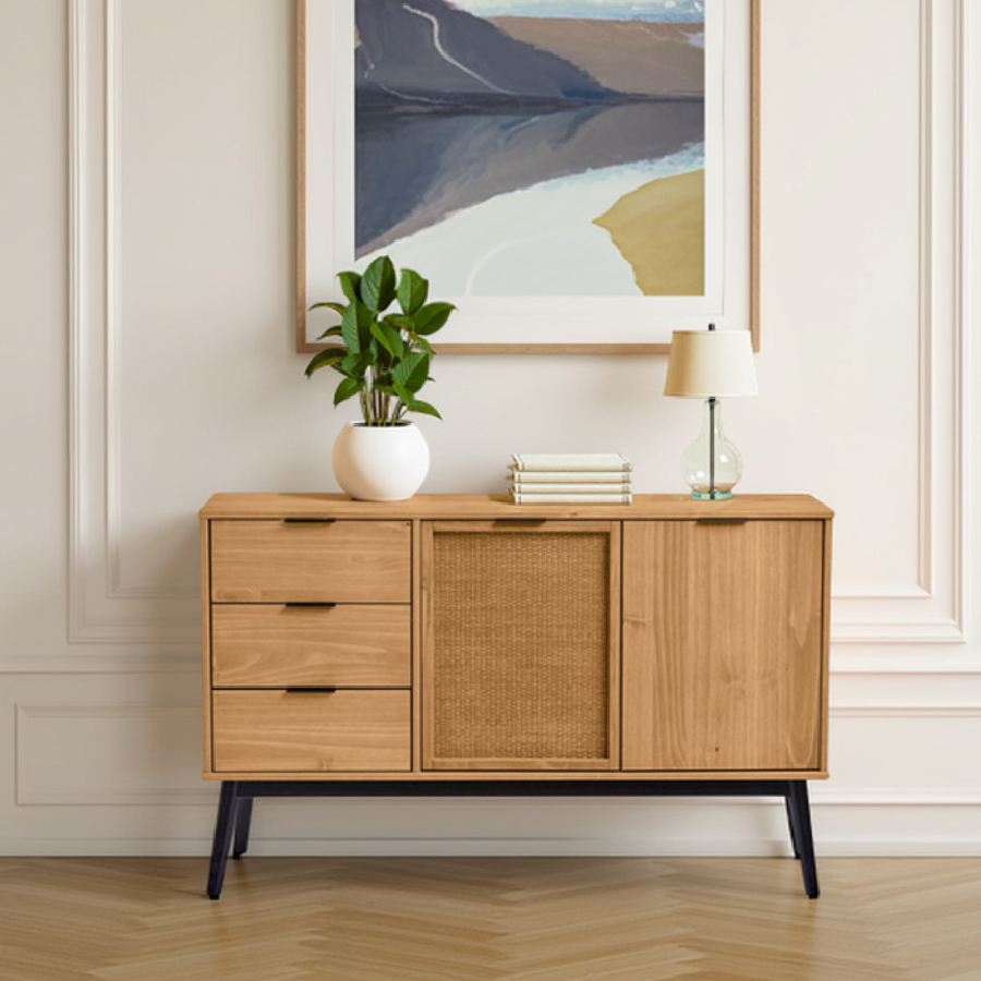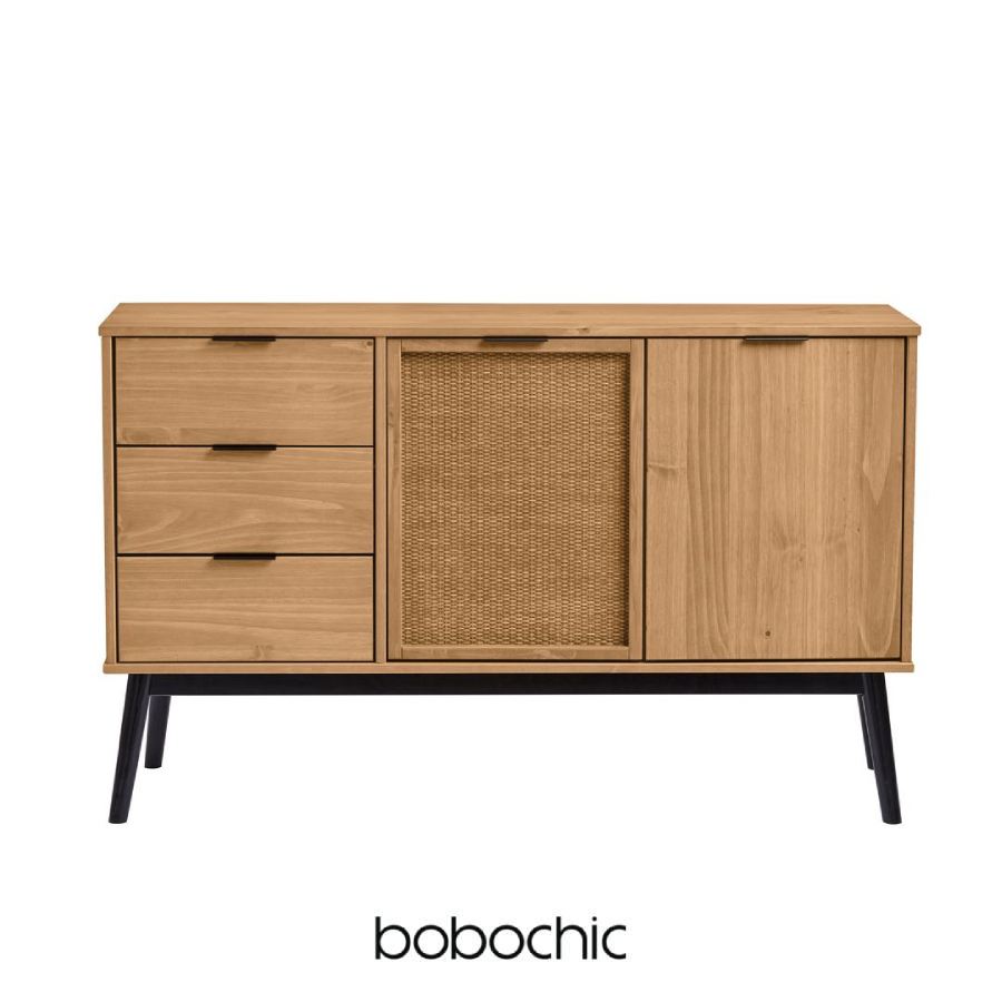 Buffet avec 2 portes et 3 tiroirs de style vintage avec structure en pin massif. Une des portes est en rotin. Les portes sont interchangeables selon vos envies. Les pieds son en pin massif peints en noir.