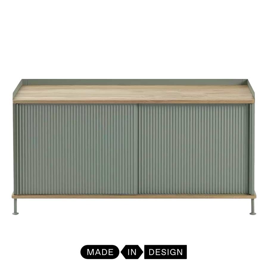 Buffet de style Scandinave, en métal et bois de chêne en couleur vert gris de la marque danoise Muuto. Ce meuble de rangement offre beaucoup d’espace. Idéal pour le séjour ou le bureau.