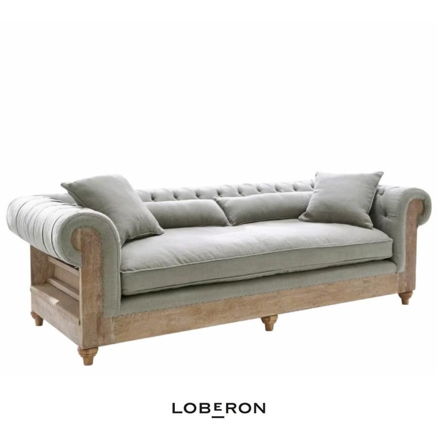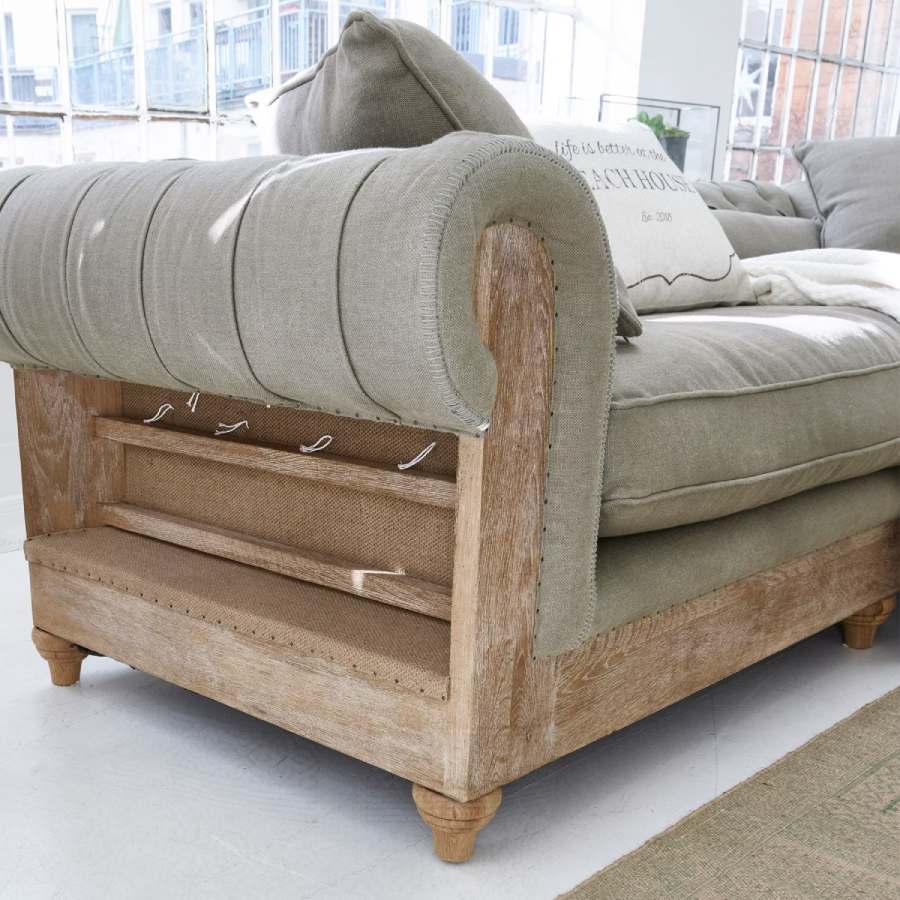 Un élégant et spacieux canapé de style Chesterfield déconstruit avec une structure en bois au fini chêne et un revêtement en lin gris avec des coutures décoratives et des rivets. Il comprend deux coussins assortis en lin gris.