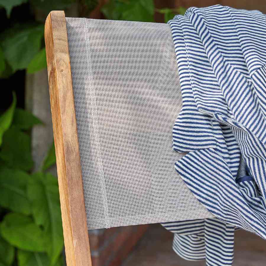 Chaise de jardin pliante en bois d’acacia massif avec finition huilé. Bois certifié FSC et résistant. L’assise et le dossier sont en textilène gris.