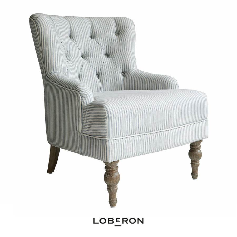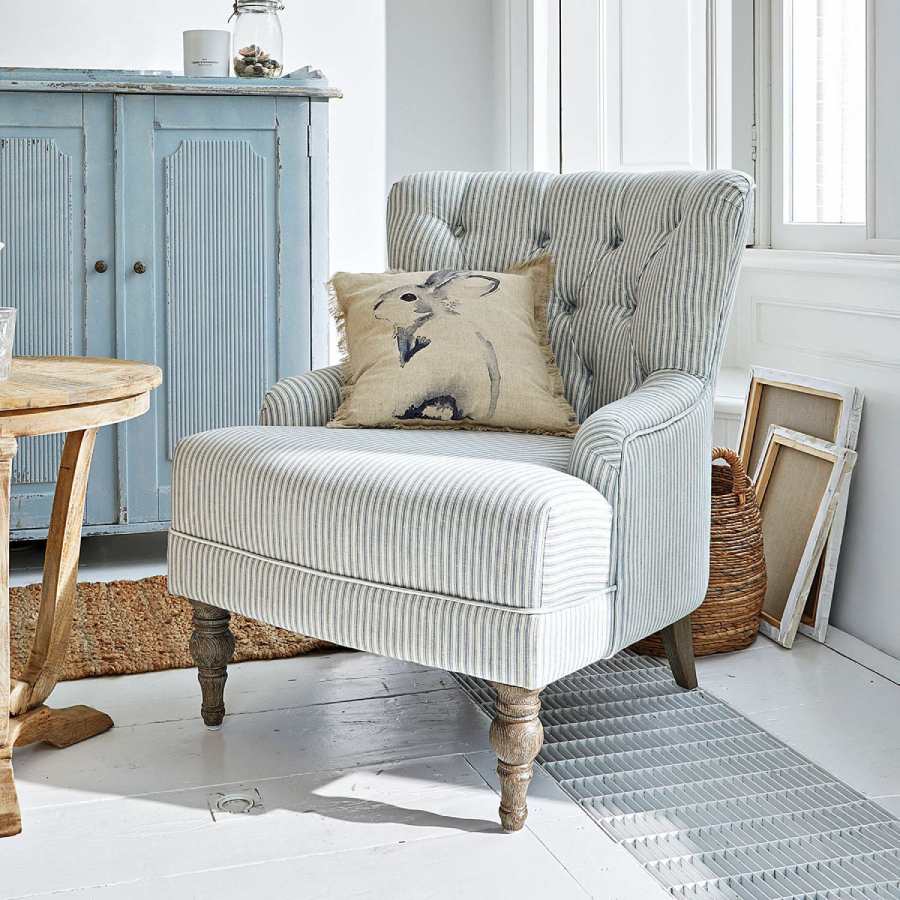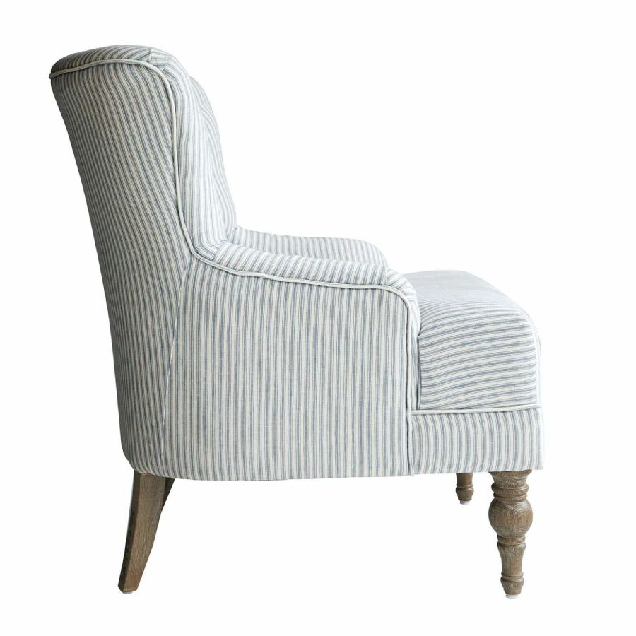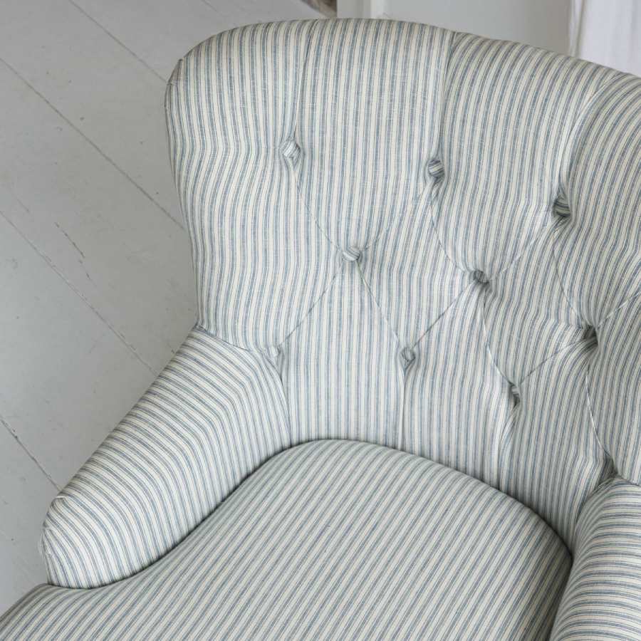 Superbe fauteuil de style britannique avec un capitonnage Chesterfield classique. La housse est en lin à motif rayé et les pieds sont en bois de chêne tournés à la main. Il offre un grand confort d’assise.