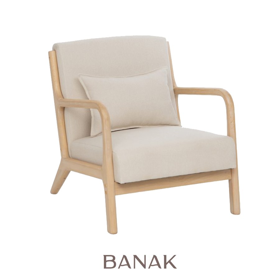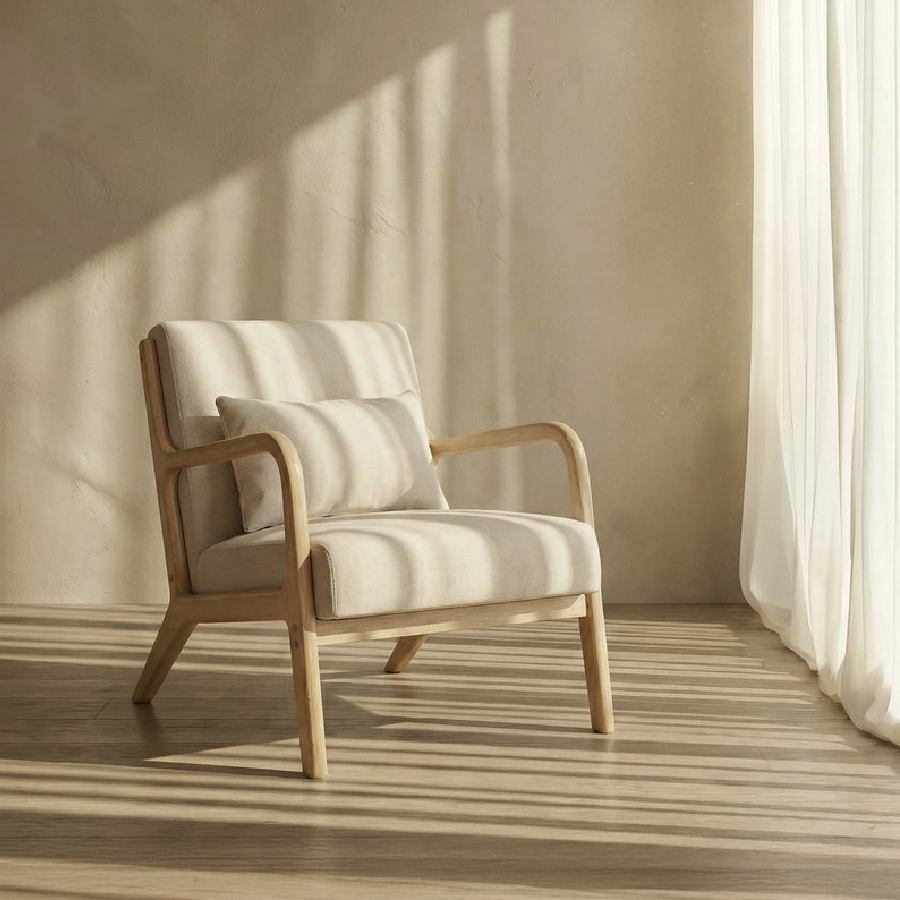 Fauteuil confortable revêtu de tissu beige avec sa structure et ses pieds en bois, ce qui en fait un meuble solide et durable. Il comprend un coussin avec le même revêtement.
