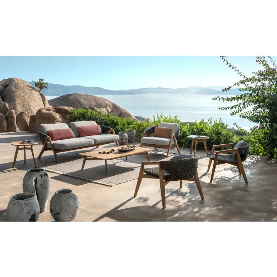 Fauteuil de jardin en teck décapé et corde gris tissée avec accoudoirs. Un fauteuil raffiné qui allie parfaitement esthétique, fonctionnalité et ergonomie
