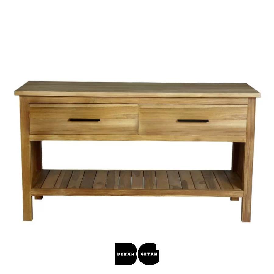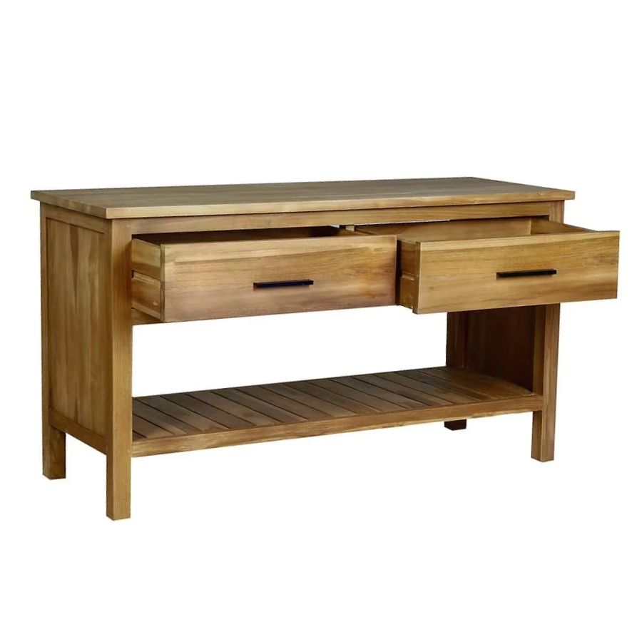 Meuble sous vasque en bois de teck équipé d’une grande niche ouverte et de deux tiroirs avec poignées noires.