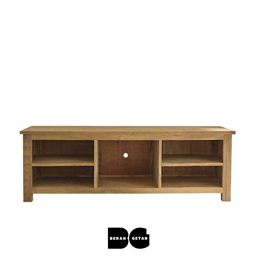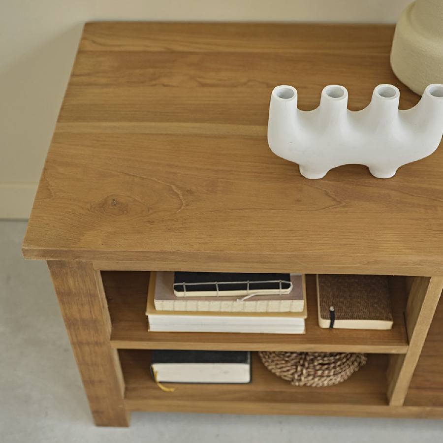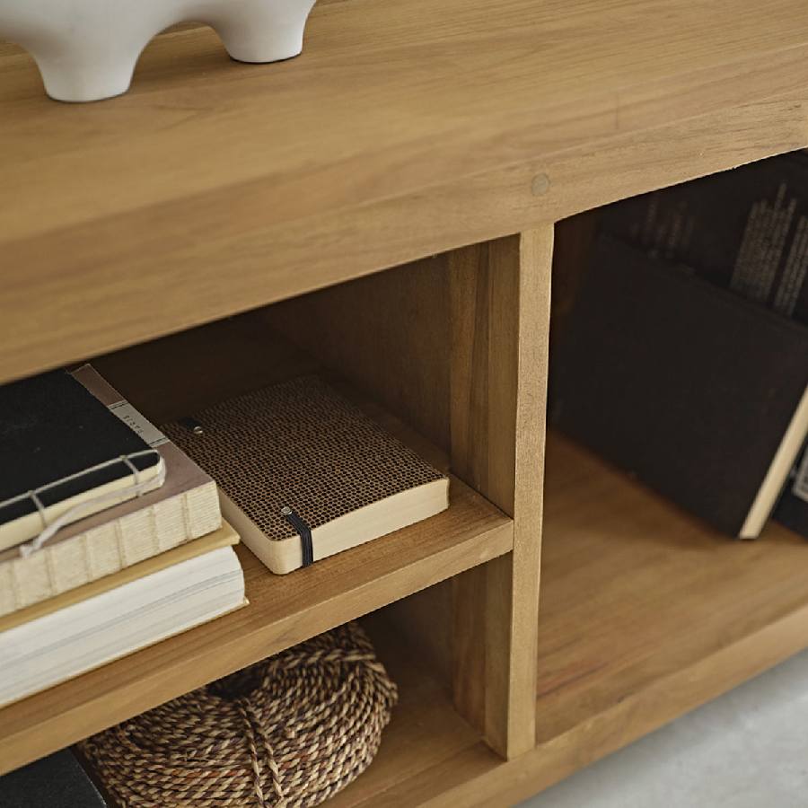 Meuble TV fabriqué en bois de teck massif, avec 5 niches et 2 étagères.