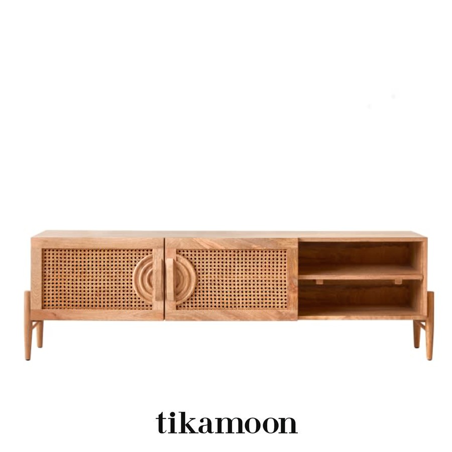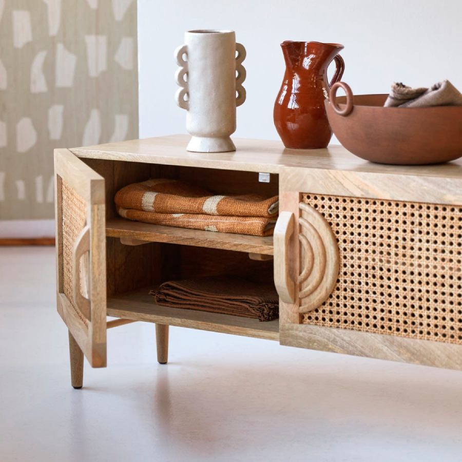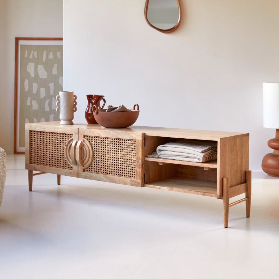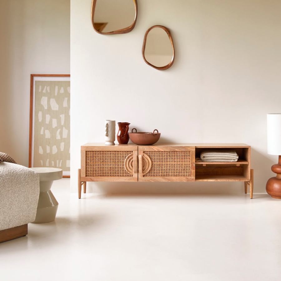 Meuble TV d’esprit neo ethnique en bois de manguier massif et rotin.