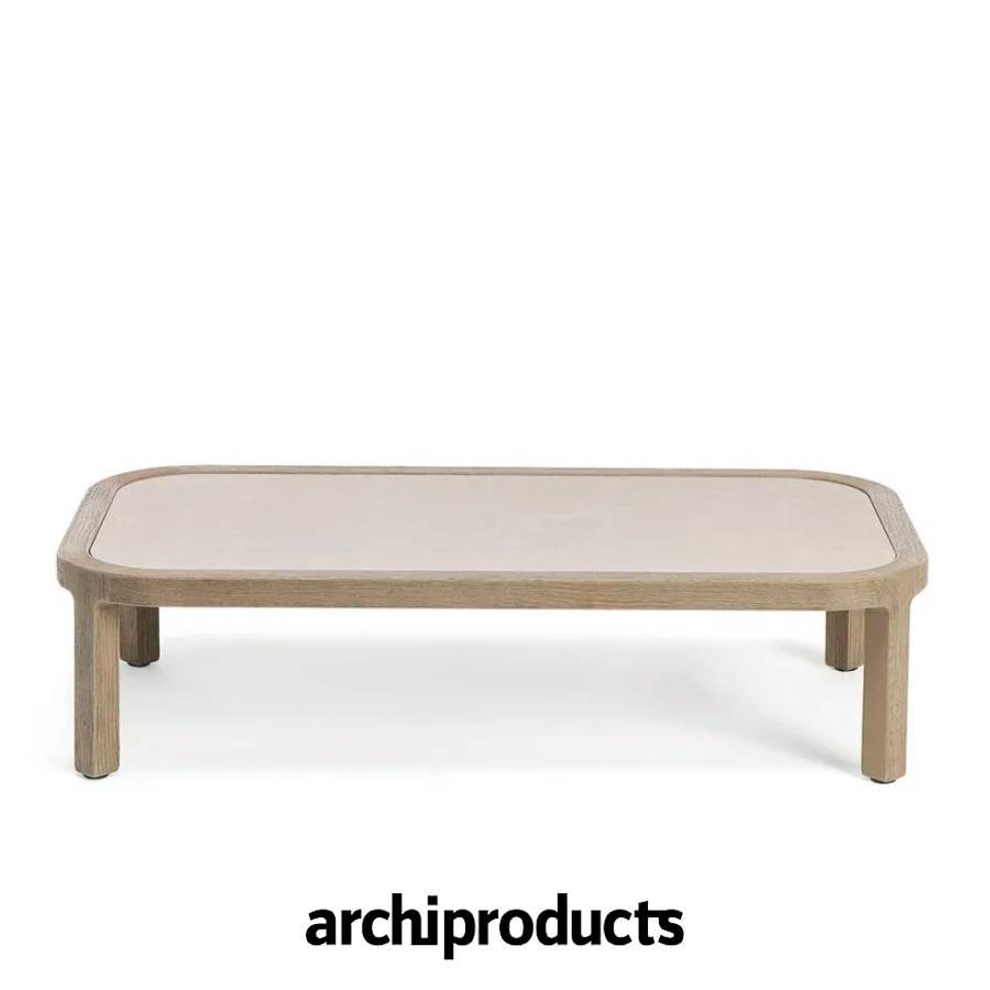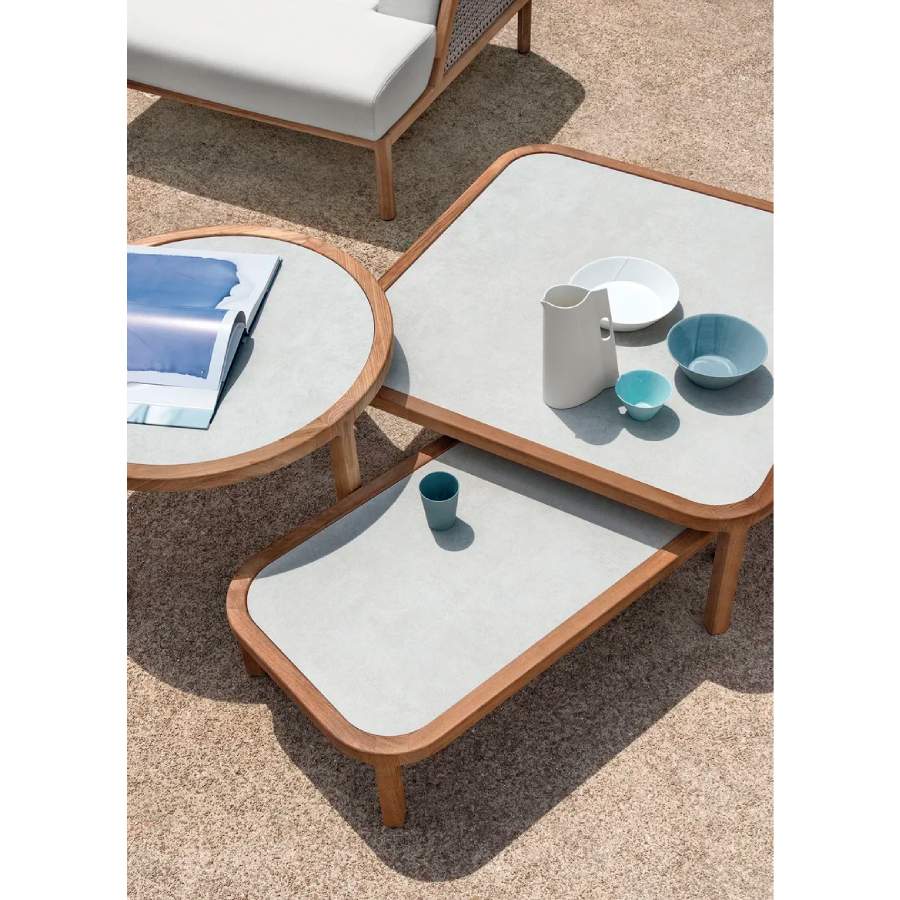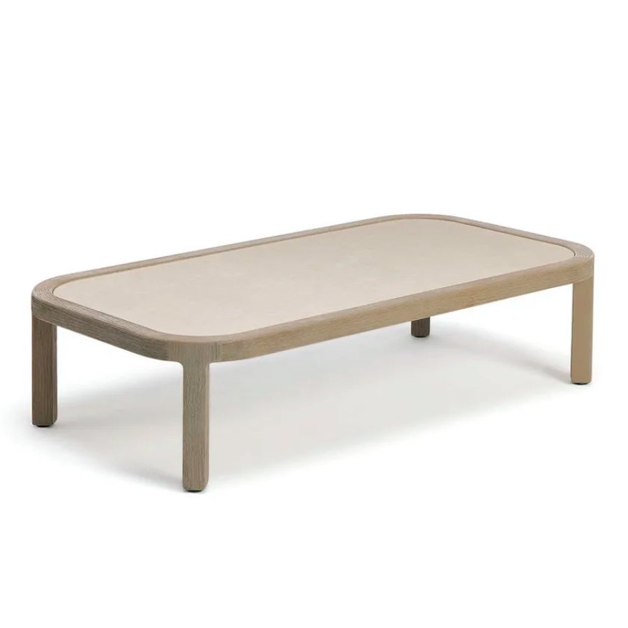Table basse de jardin rectangulaire avec structure en teck naturel ou décapé et dessus en pierre céramique.
