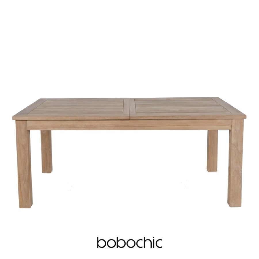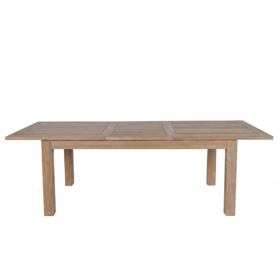 Table de jardin robuste et extensible avec structure en bois de teck recyclé certifié. Une vaste table rectangulaire en teck, équipée d’un mécanisme d’allonge intégré, offrant la possibilité d’agrandir aisément sa longueur de 200 à 260 cm. Parfaite pour recevoir confortablement de nombreux invités.