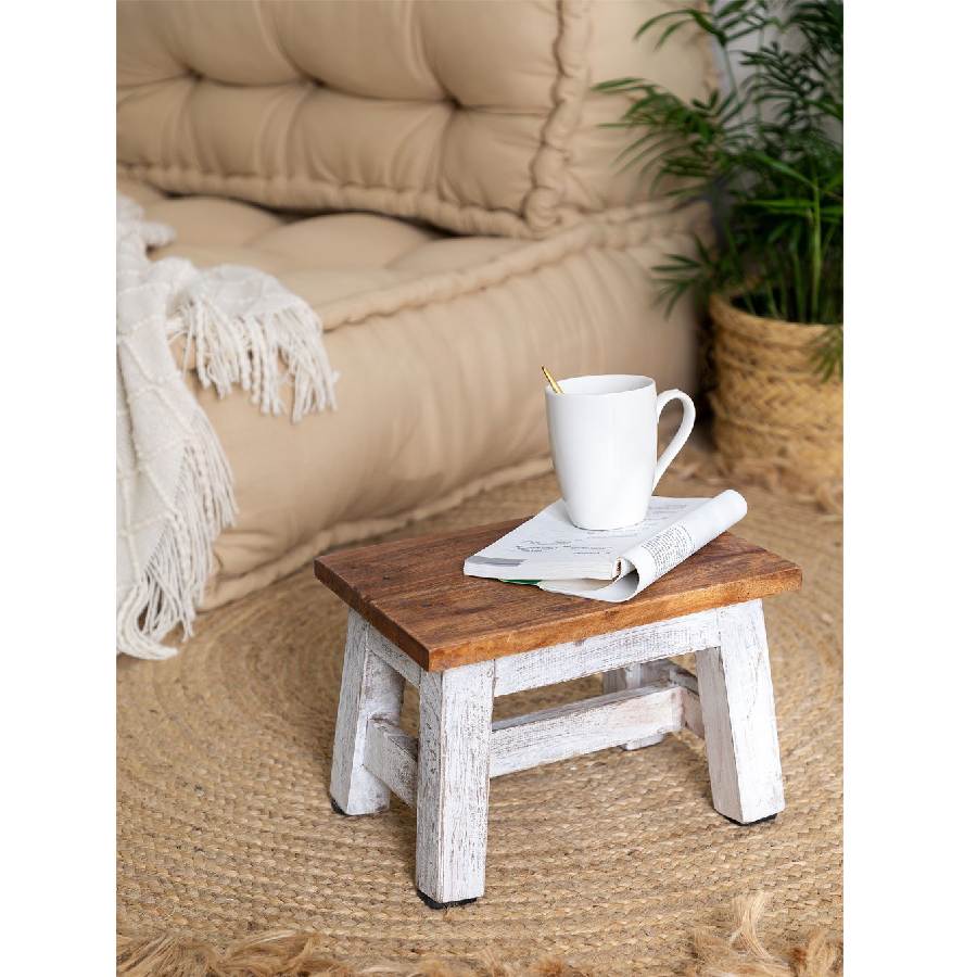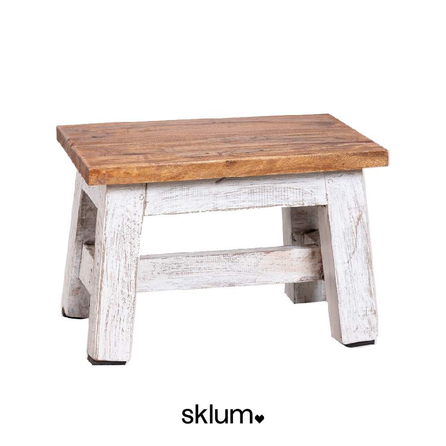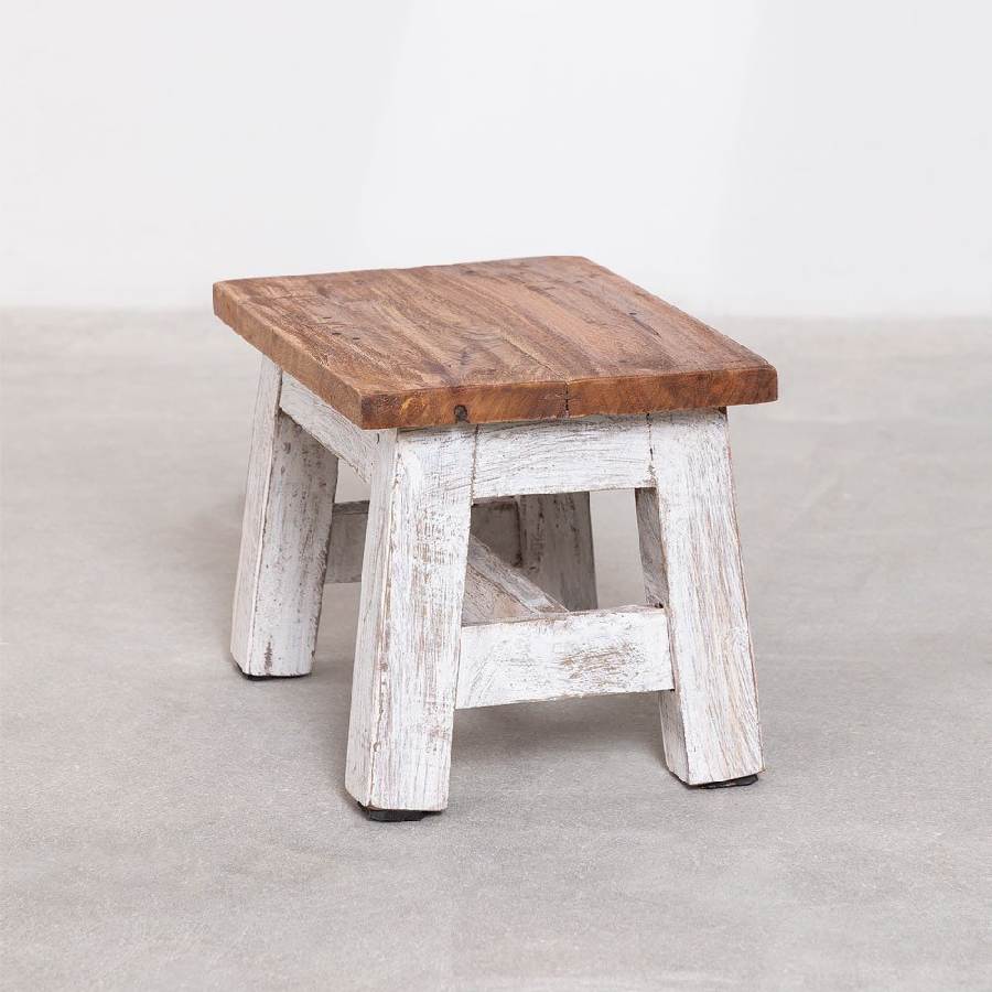 Petit tabouret bas fabriqué à partir de bois recyclé, alliant une finition naturelle à une patine blanche. Il peut présenter de légères variations dues à sa finition artisanale. Il s’intègre très bien dans les intérieurs de style rustique.