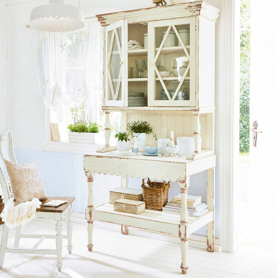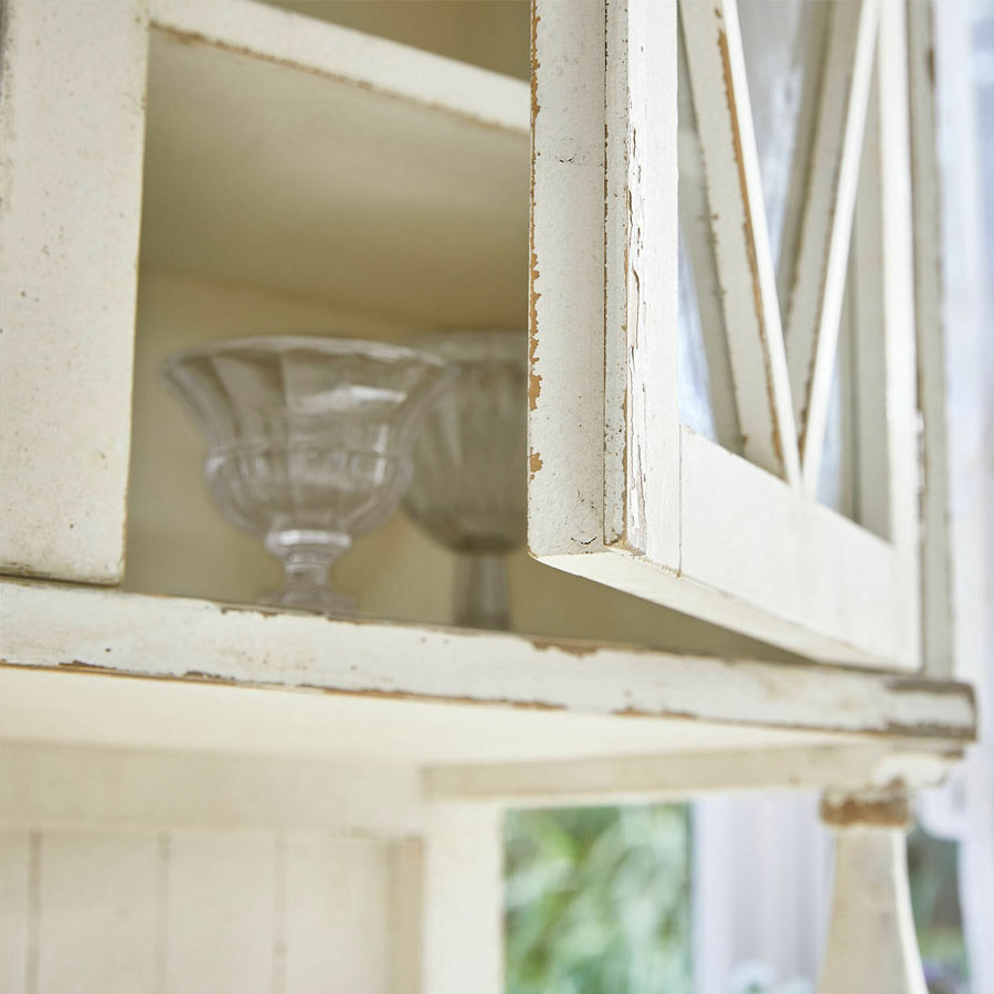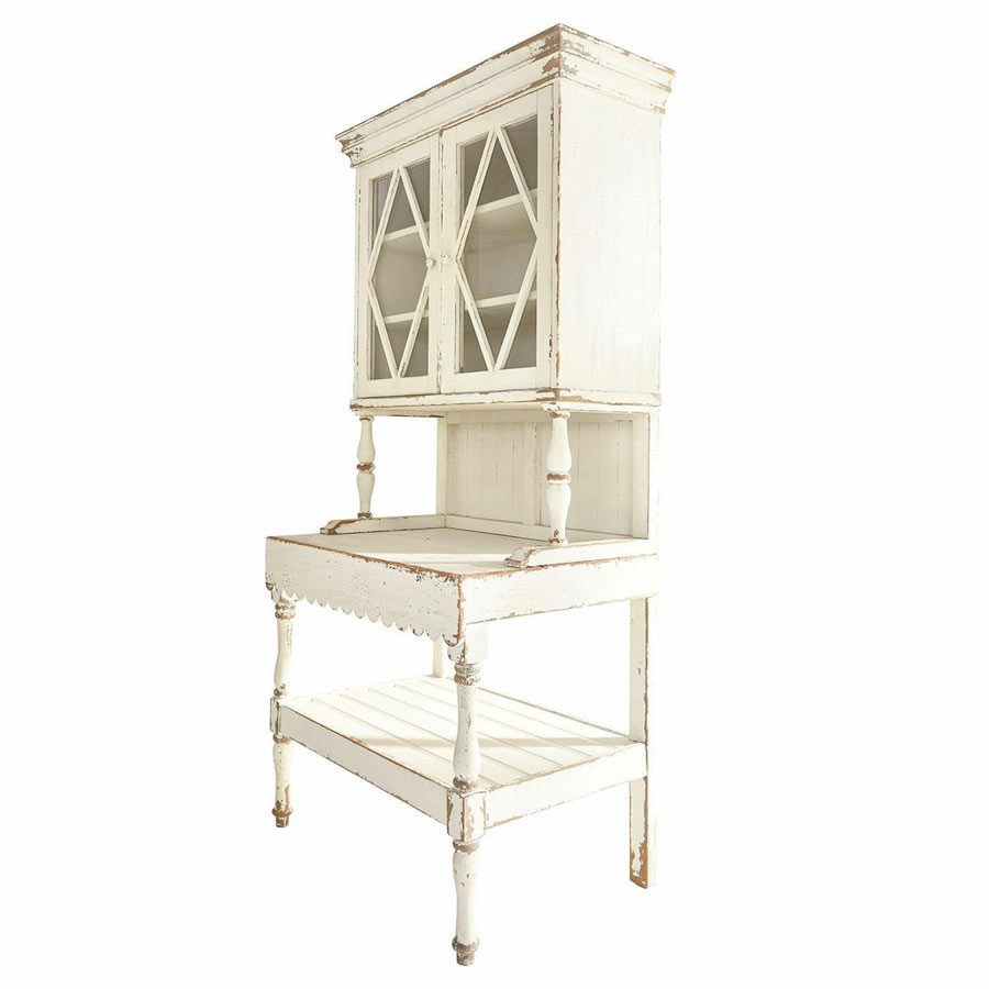 Magnifique buffet style secrétaire en bois de pin à l’effet vieilli. La partie supérieure est travaillée à la manière d’un buffet classique, avec ses portes vitrées qui protégeront vaisselle et d’autres objets. La partie basse est une table très raffinée est soulignée d’ornements ondulés.