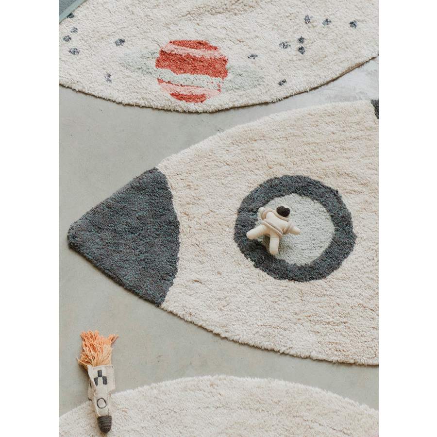 Divertida alfombra con forma de cohete para la habitación de los más pequeños. Está tejida a mano con algodón natural y es una alfombra lavable en la lavadora siguiendo las instrucciones y cuidados. Viene con un pequeño astronauta para fomentar el juego creativo.