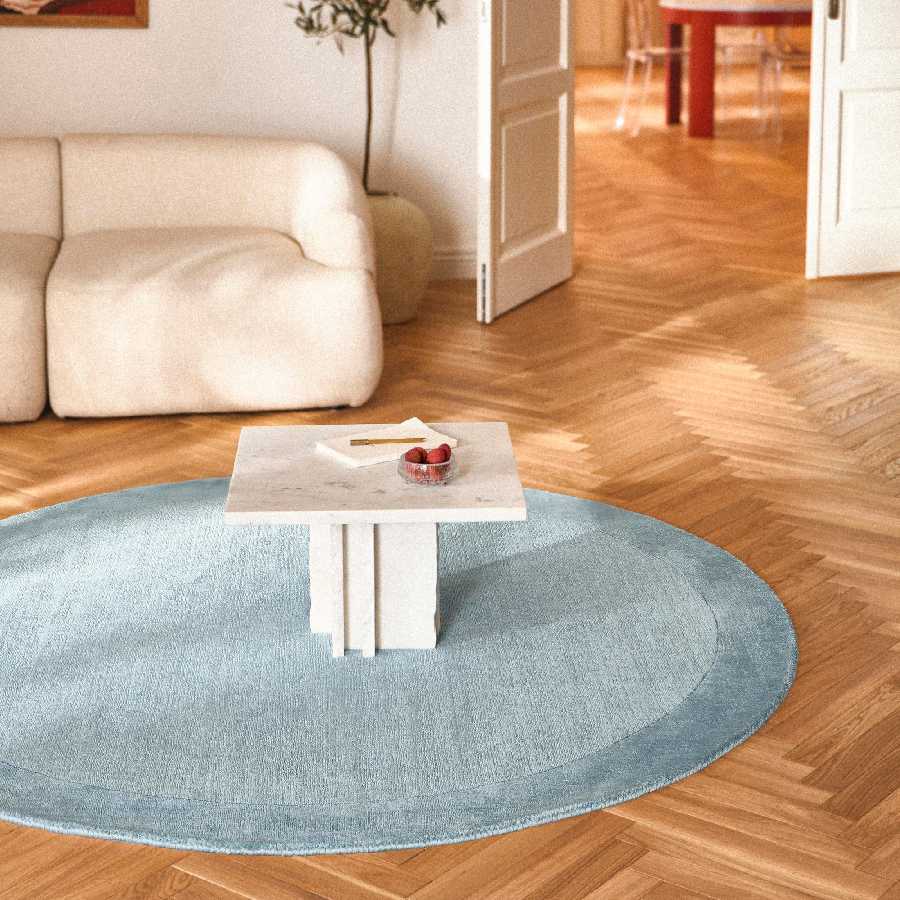 Alfombra redonda de suave pelo corto robusta y de fácil cuidado.