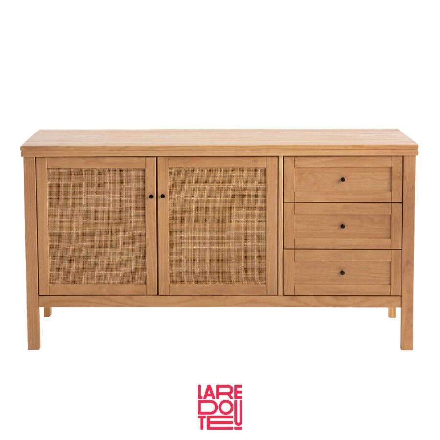 Aparador de madera de pino y mimbre con dos puertas y tres cajones.
