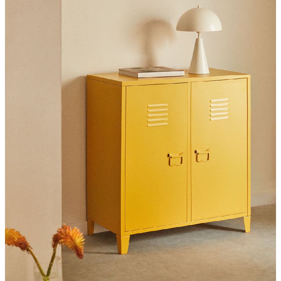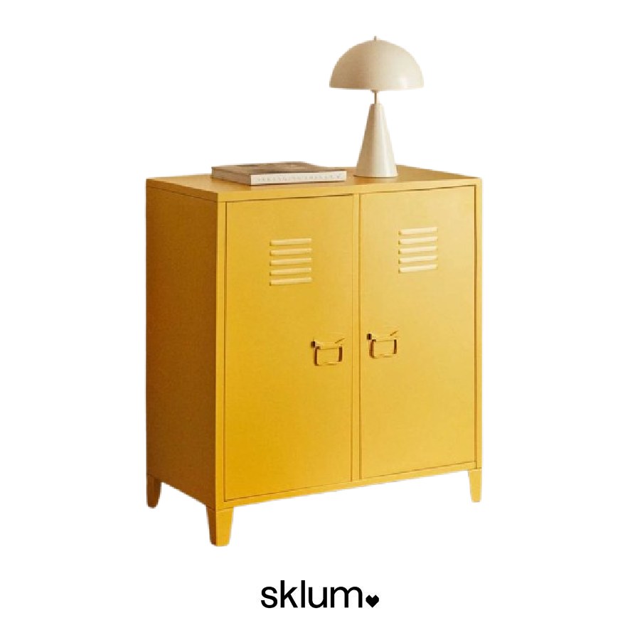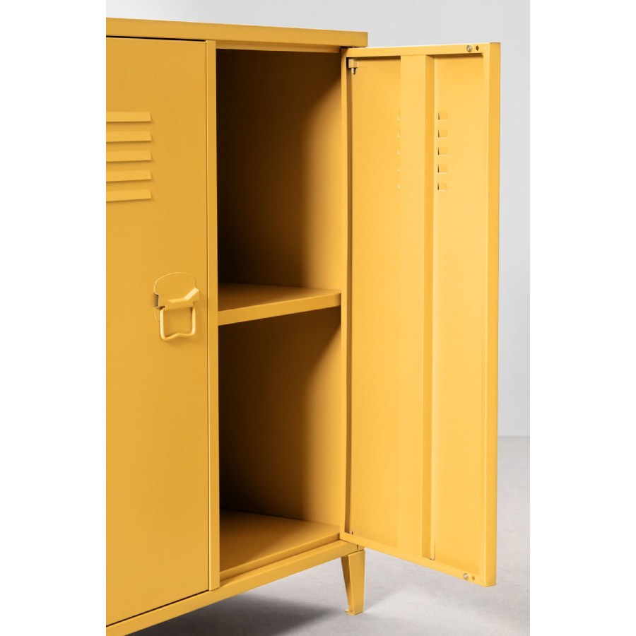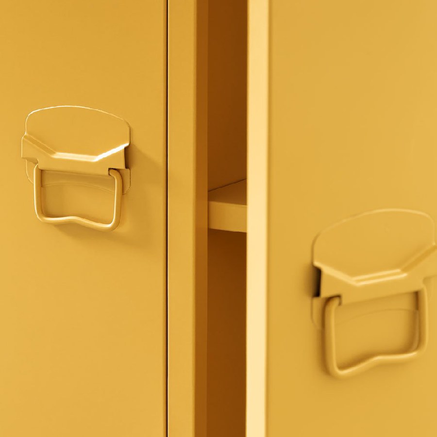 Aparador compacto de metal en llamativo color amarillo con dos puertas y una balda. Inspirado en una taquilla, es una opción original para mantener el orden con personalidad. Este aparador resistente y moderno es la pieza ideal para dar carácter a cualquier estancia con un toque urbano y contemporáneo.