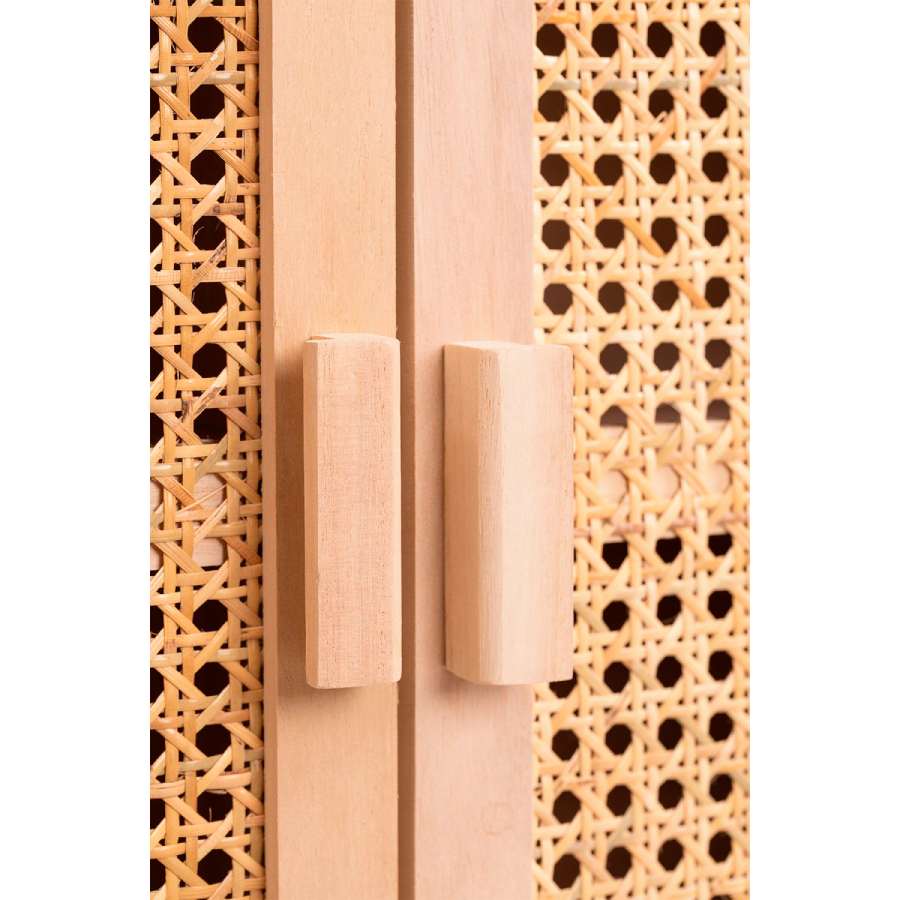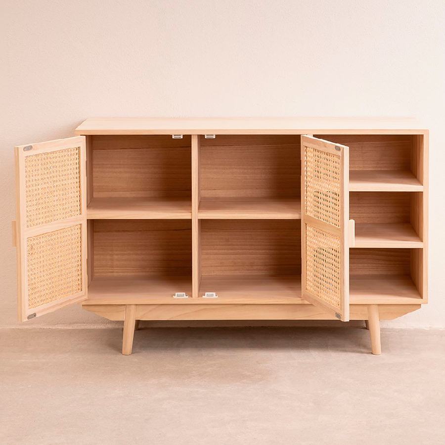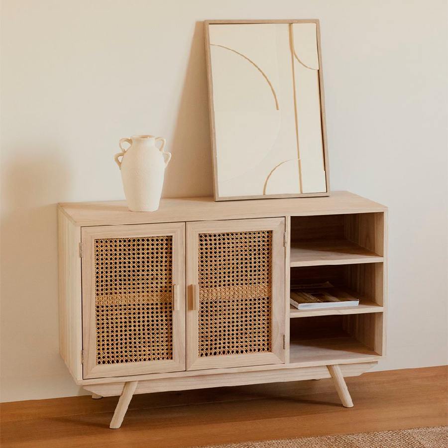 Coqueto aparador fabricado en madera de paulownia con paneles de ratán en las puertas.