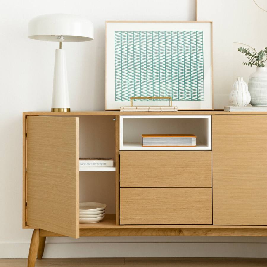 Dale carácter a tu salón con este aparador de acabado desgastado, diseño funcional de 2 puertas y 2 cajones con sistema push, estructura en DM chapado en roble. Combina estética rústica con elegancia moderna. Solidez, estilo y personalidad en un solo mueble.