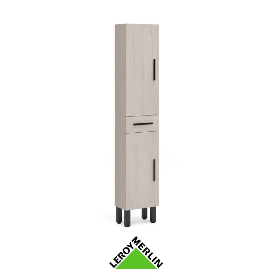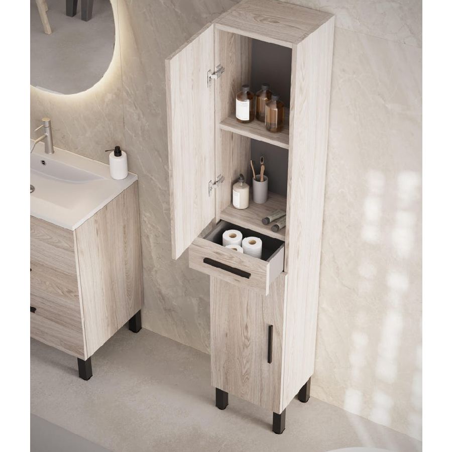Columna de baño con 2 puertas con dos estantes móviles y uno fijo y 1 cajón. Está fabricado en España.
