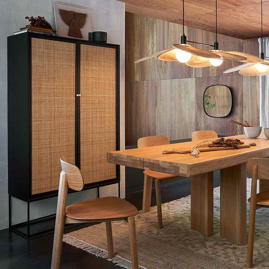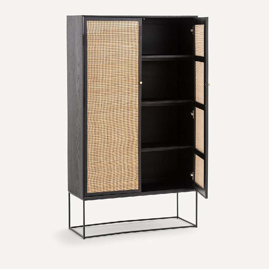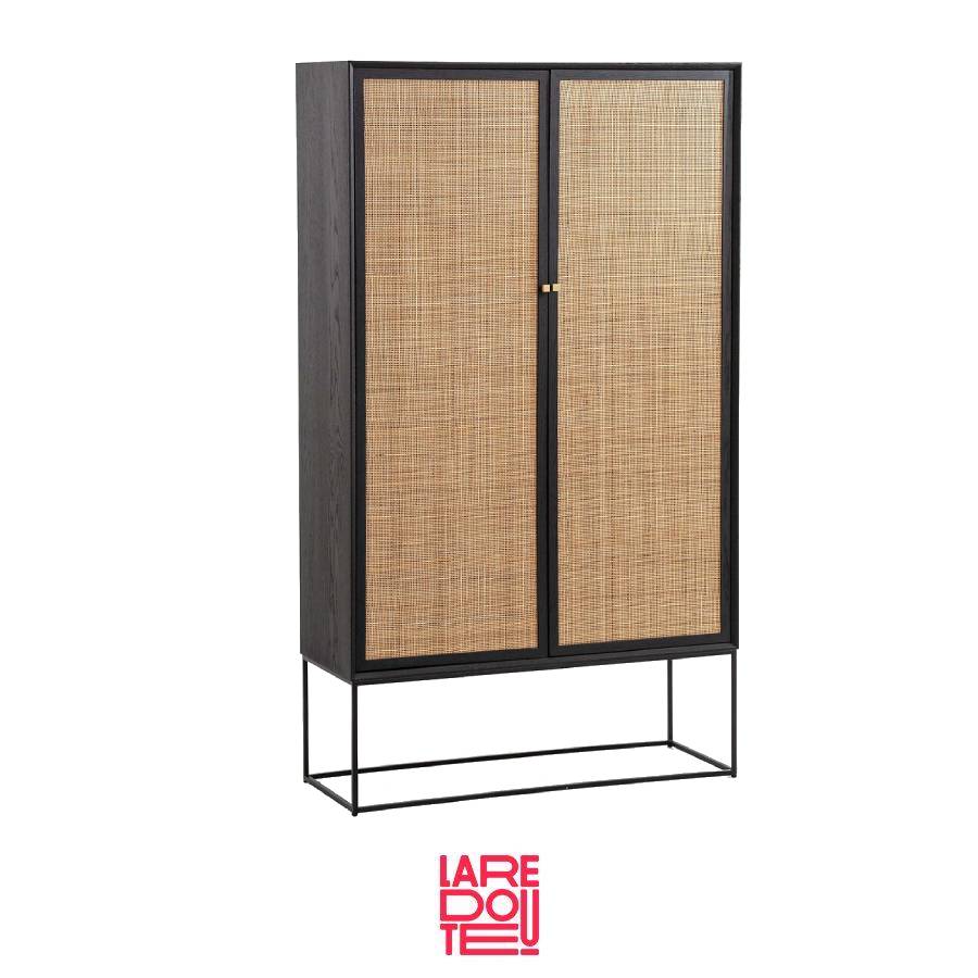 Armario compuesto por una estructura de MDF con chapa de roble teñida de negro, puertas con paneles de ratán trenzado artesanalmente y tiradores de latón, y patas metálicas. Incluye 3 estantes (1 fijo + 2 ajustables con 3 posiciones).