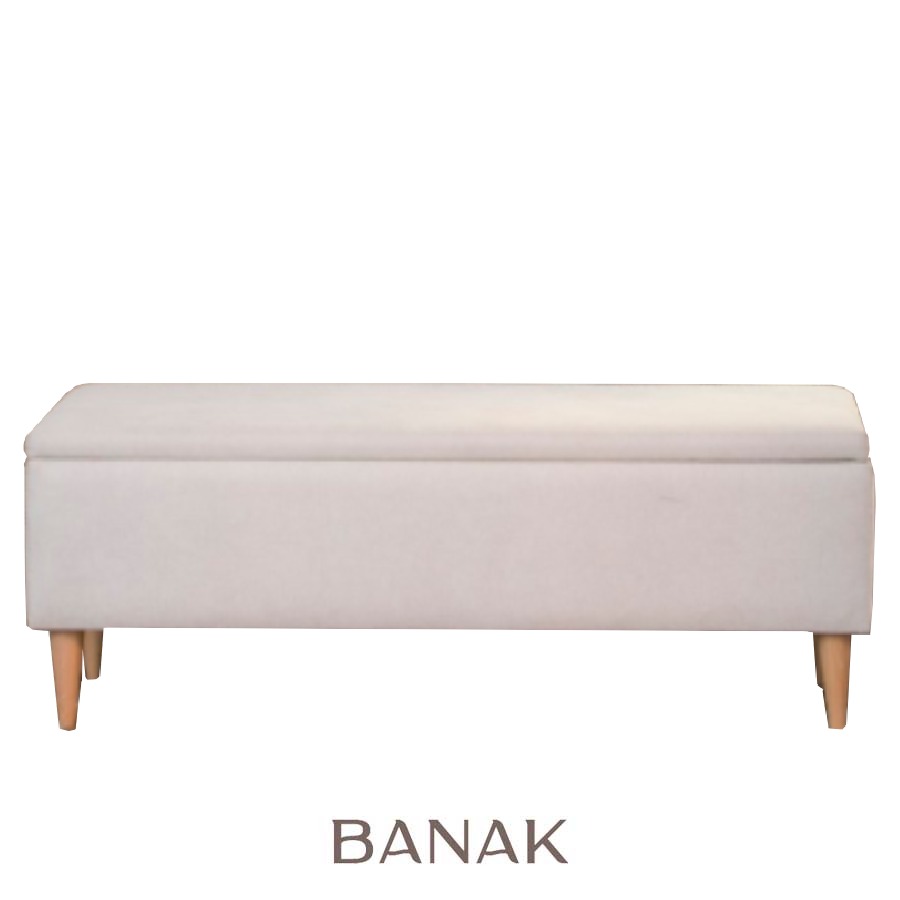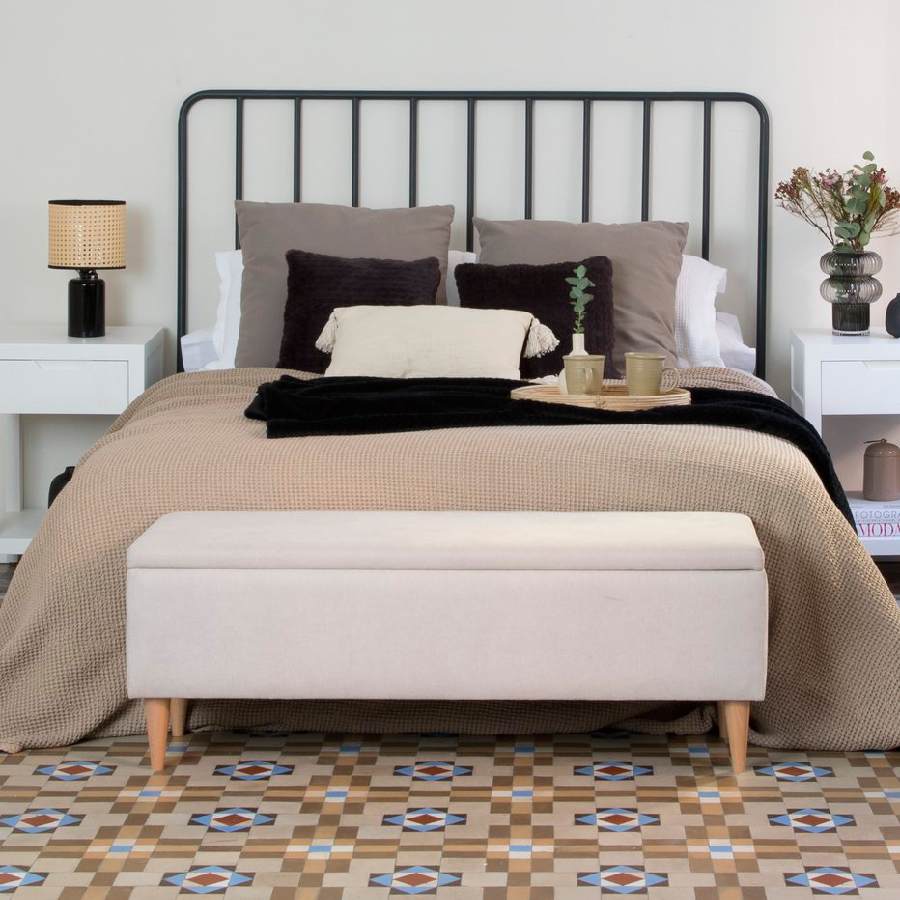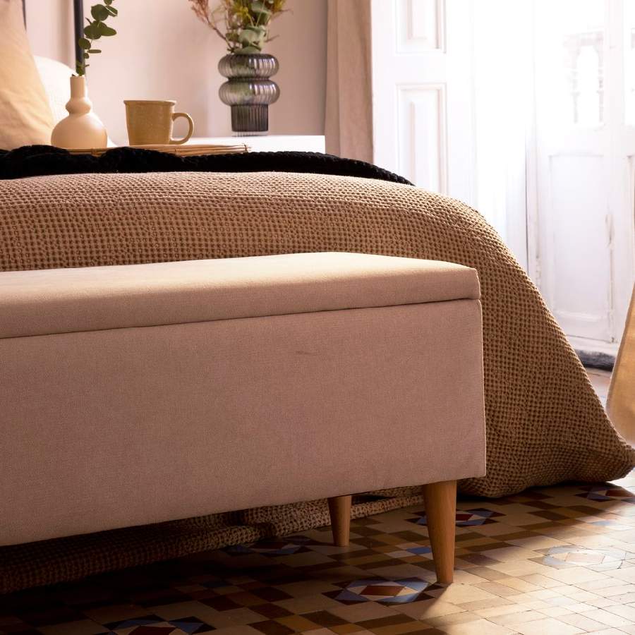 Banco o pie de cama con opción de almacenaje que combina funcionalidad y diseño en una sola pieza. Con un tapizado cómodo y resistente, incorpora espacio interior para mantener el orden en recibidores o dormitorios. Su tejido antimanchas y estilo atemporal lo convierten en un complemento práctico, versátil y decorativo para el día a día.