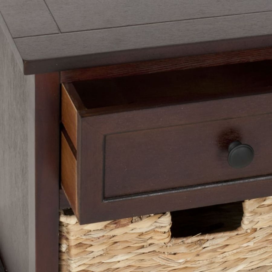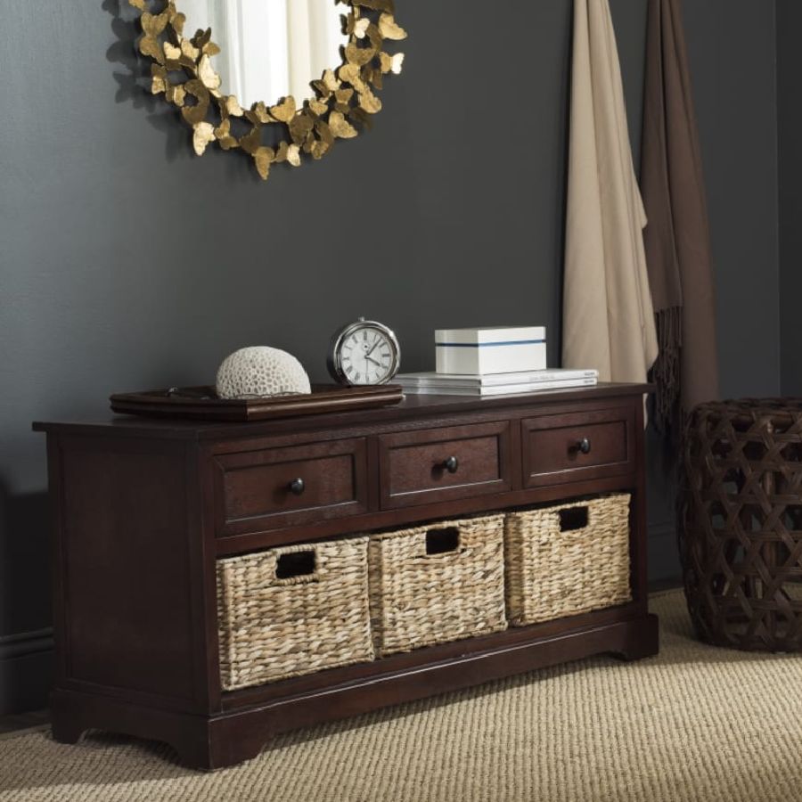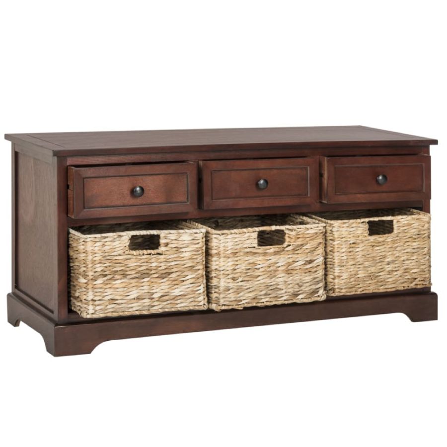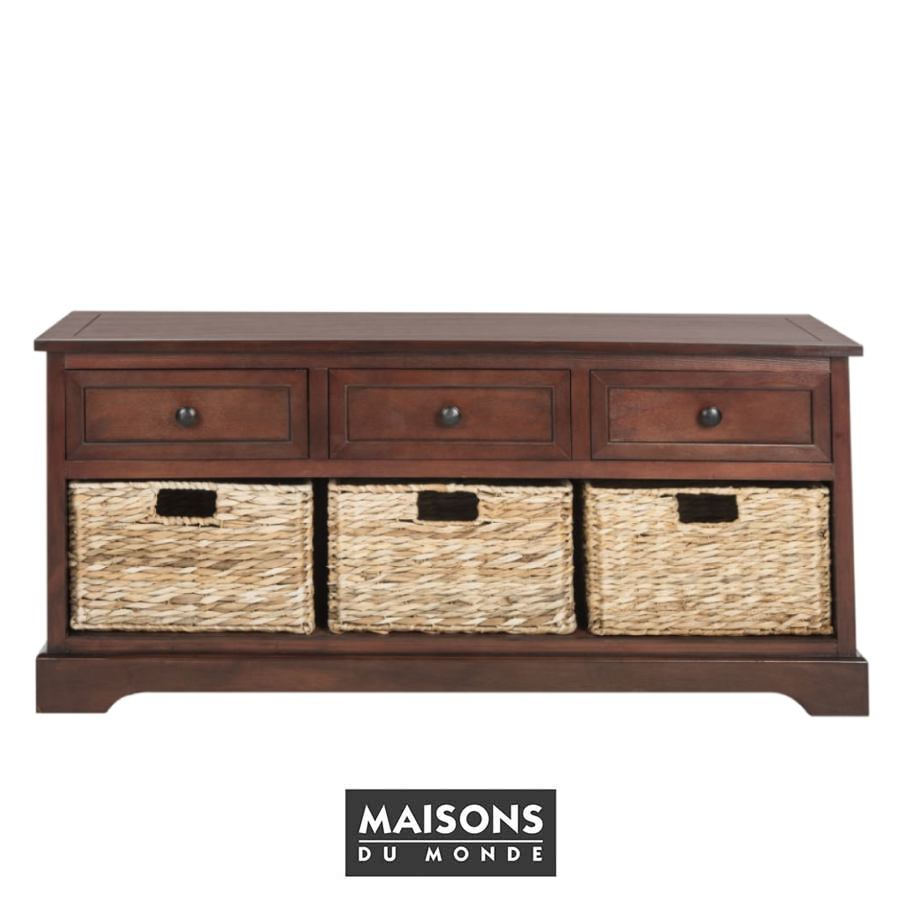 Práctico banco de madera con 3 cajones y 3 compartimentos para almacenamiento formados por cestos de fibra vegetal. Un elección que se adapta a cualquier estancia.