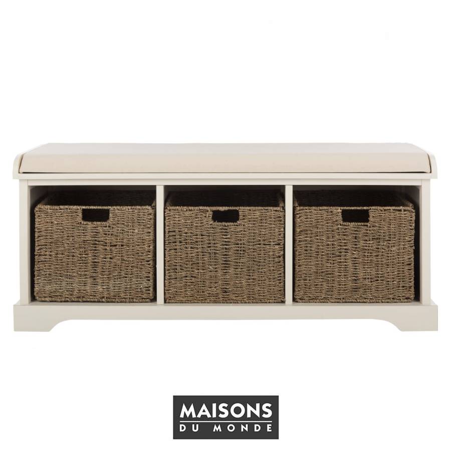 Práctico banco de madera blanca con 3 compartimentos para almacenamiento formados por cestos de ratán. El cojín es de algodón. Perfecto para cualquier estancia.