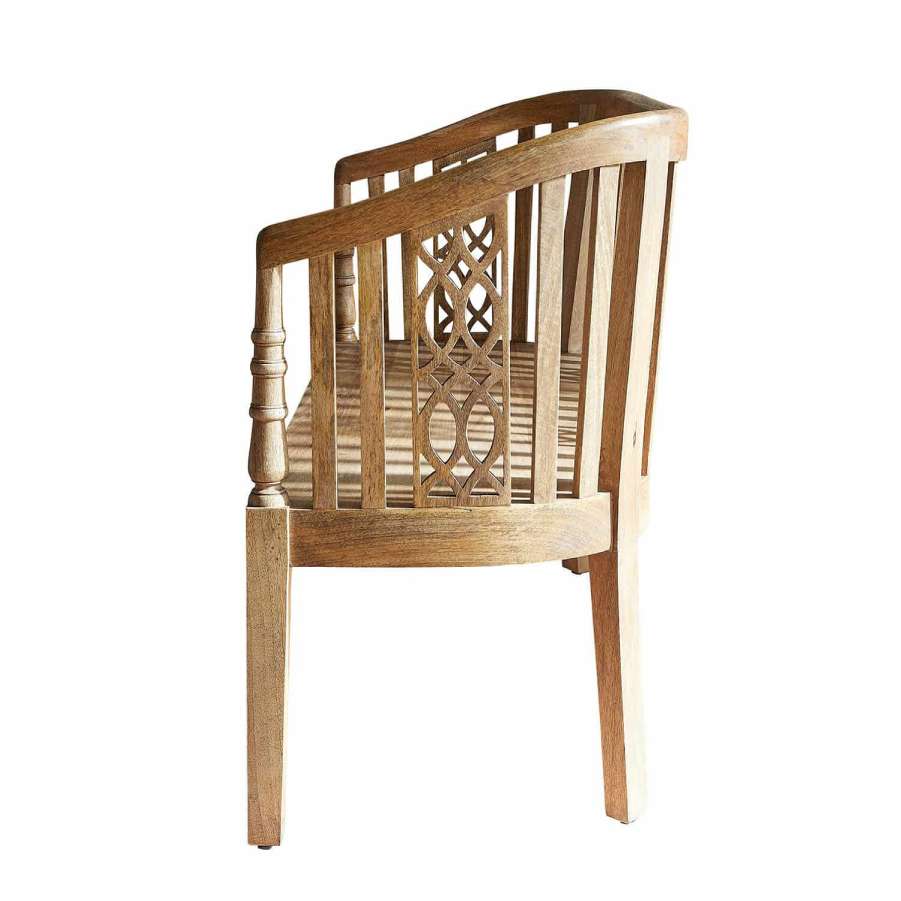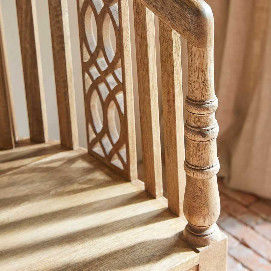 Elegante banco de madera de mango con detalles ornamentales torneados a mano inspirado en los elegantes asientos de los jardines paisajistas ingleses.