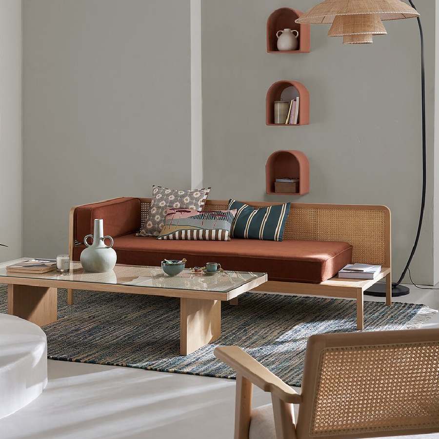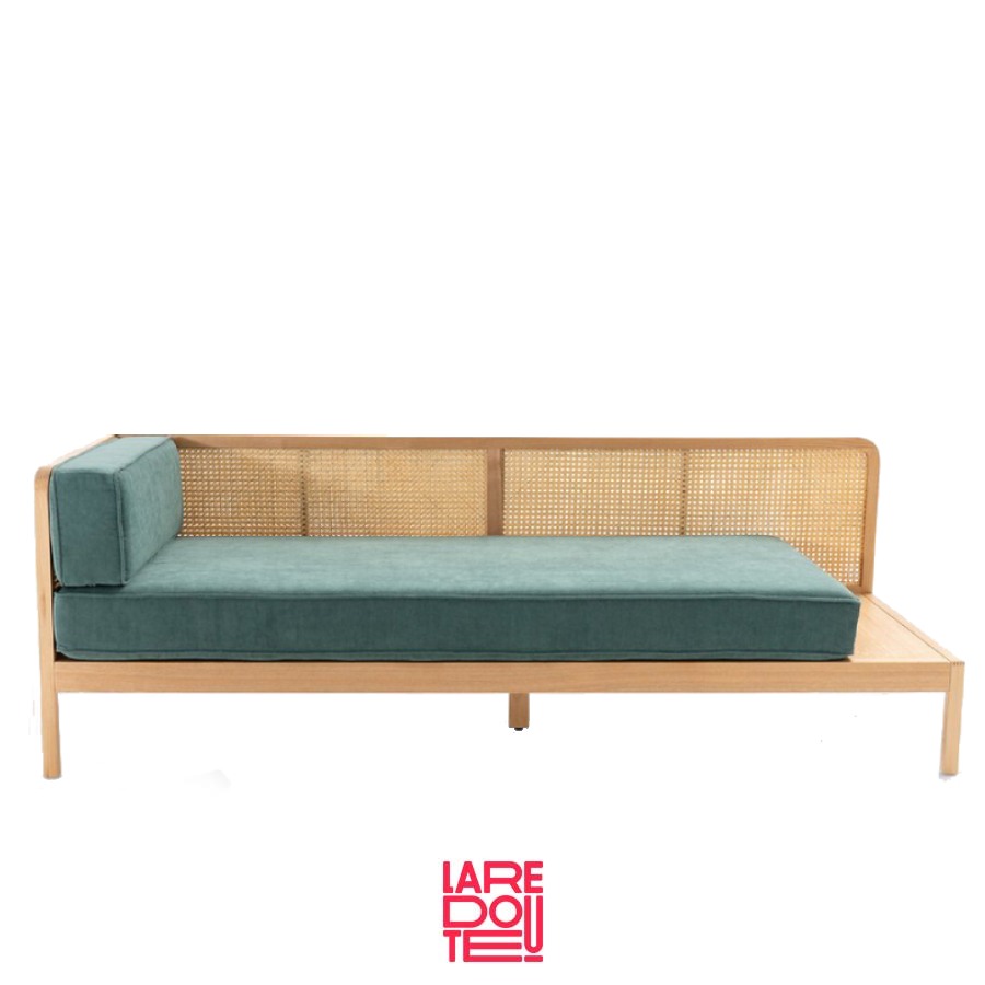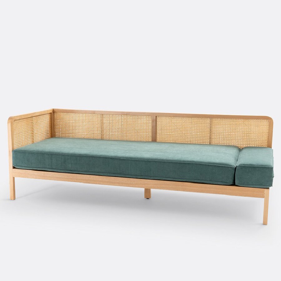 Elegante banco o pequeño sofá de aire vintage, con estructura de madera, respaldo de ratán y cojín verde.