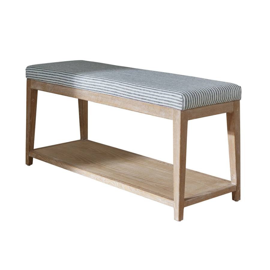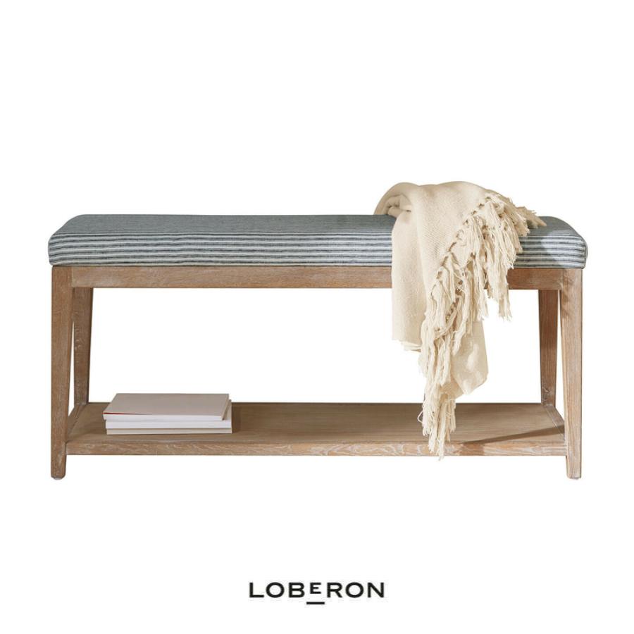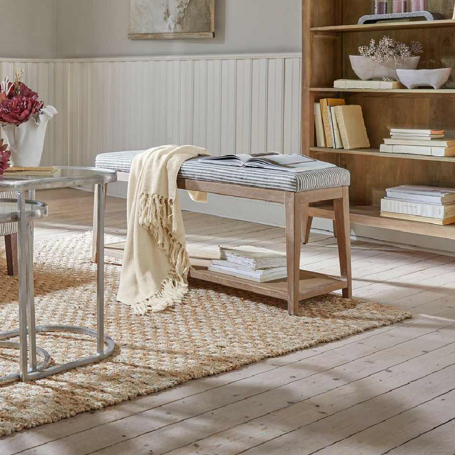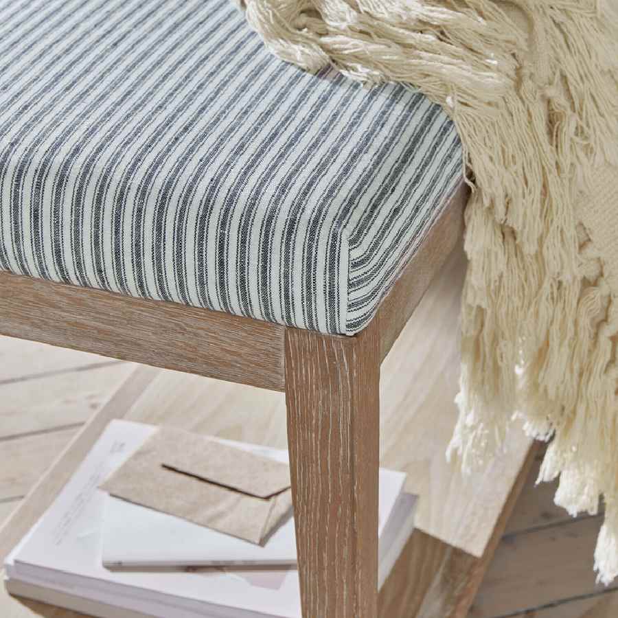 Preciosa banqueta con estructura de roble macizo que muestra su veteado natural, con un cómodo asiento acolchado tapizado en lino a rayas azul y crema.