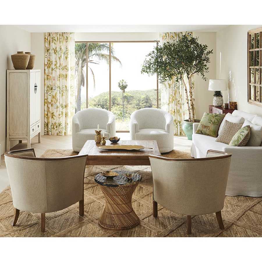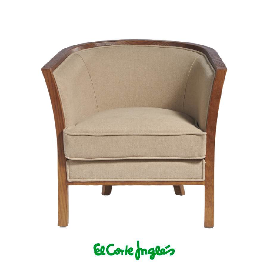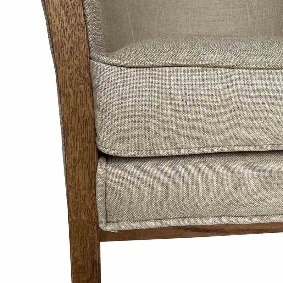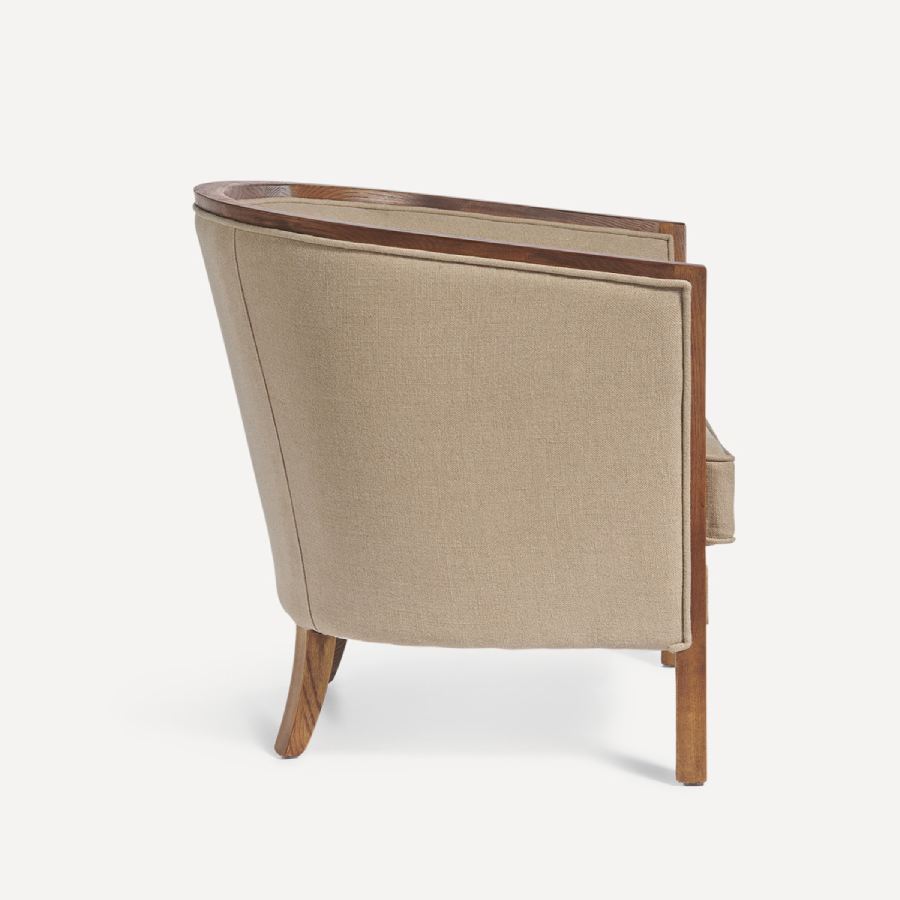 Elegante y cómoda butaca con reposabrazos con estructura de madera vista de roble y tapizado de lino. El cojín del asiento es desenfundable.