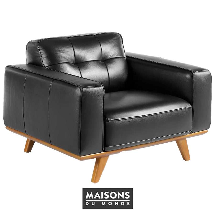 Elegante y sofisticada butaca con reposabrazos tapizada en piel de vacuno en color negro con capitoné
