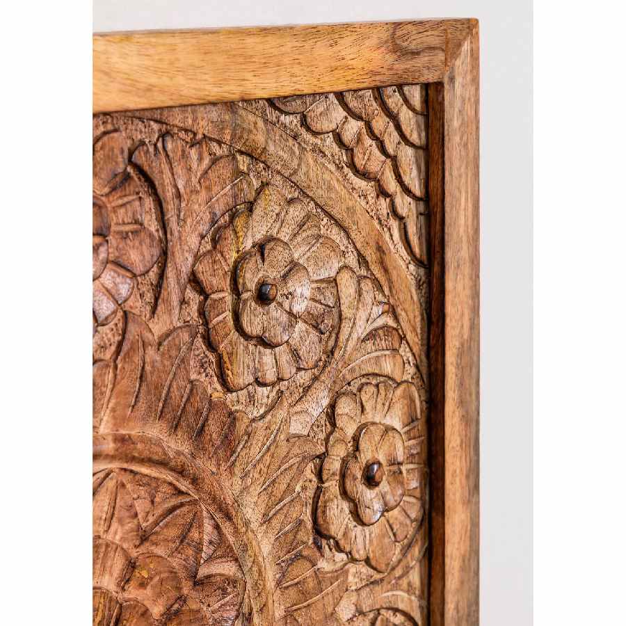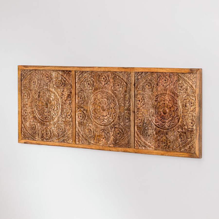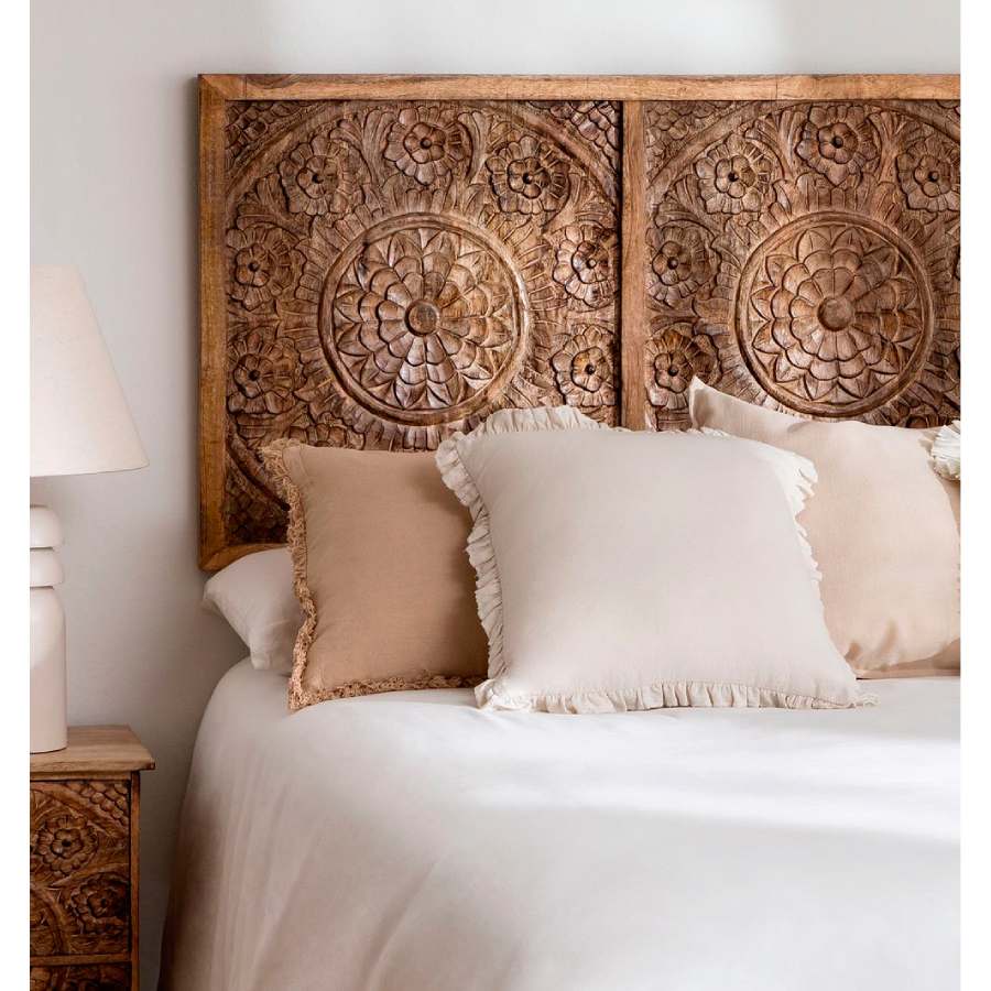 Cabecero para cama de 150 cm de madera de mango tallada a mano con motivos naturales.