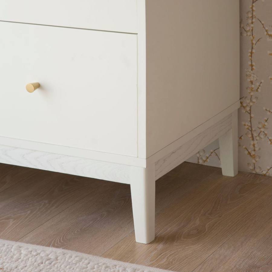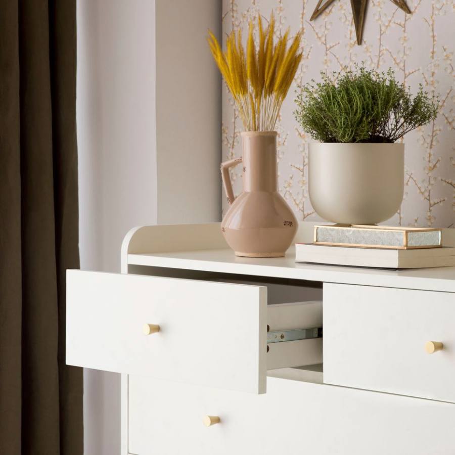 Preciosa cómoda de estilo vintage con 5 cajones con diferente espacio de almacenamiento. Fabricado en madera lacada en blanco y con tiradores dorados.
