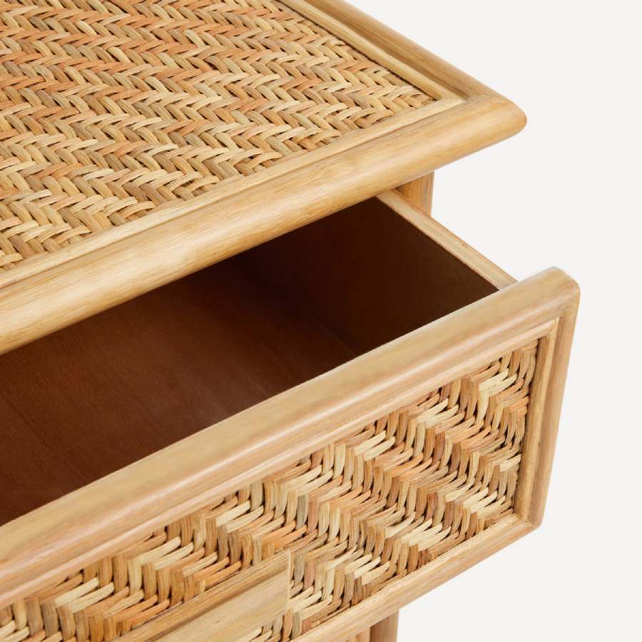 Cómoda con 4 cajones de estética años 60 fabricada en ratán de manera artesanal. No necesita montaje.