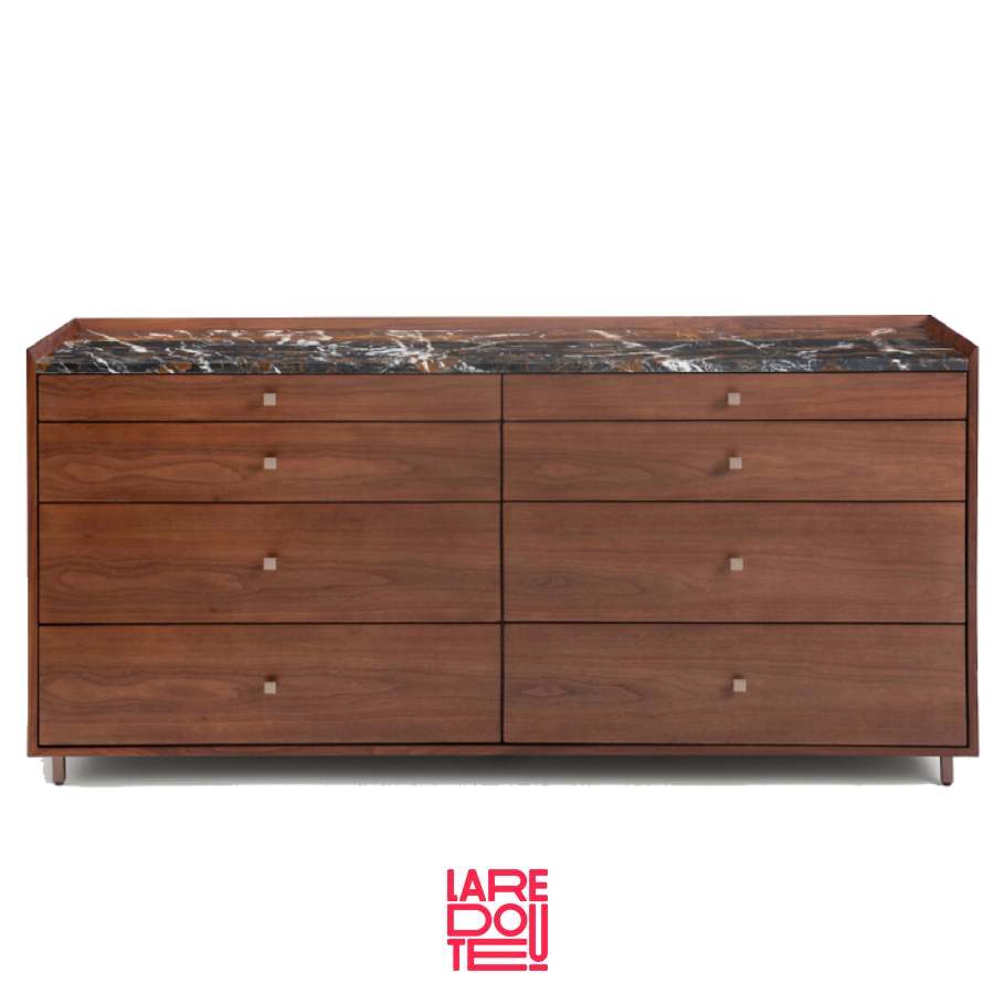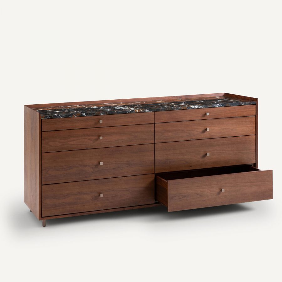 Cómoda de 8 cajones de madera de nogal con superficie de mármol ámbar y tiradores de metal acabado mate.
