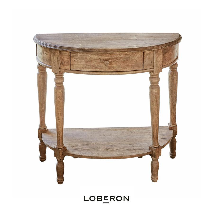 Preciosa consola semicircular de madera de mango con patas torneadas a mano. Dispone de un cajón y una balda inferior.