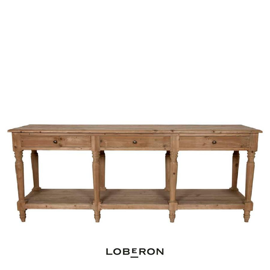 Preciosa consola de madera de abeto recuperada con pátina natural y patas torneadas a mano. Dispone de tres cajones para un amplio espacio de almacenamiento.