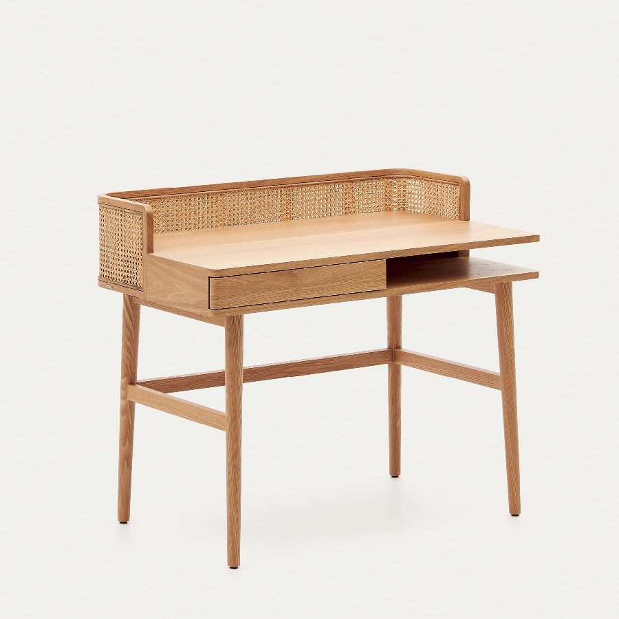 Precioso escritorio formado por una mesa de chapa y madera maciza de fresno y un panel trasero de ratán trenzado que le confiere un estilo especial. El cajón dispone de apertura a presión y las patas son regulables para obtener un ajuste de altura óptimo.