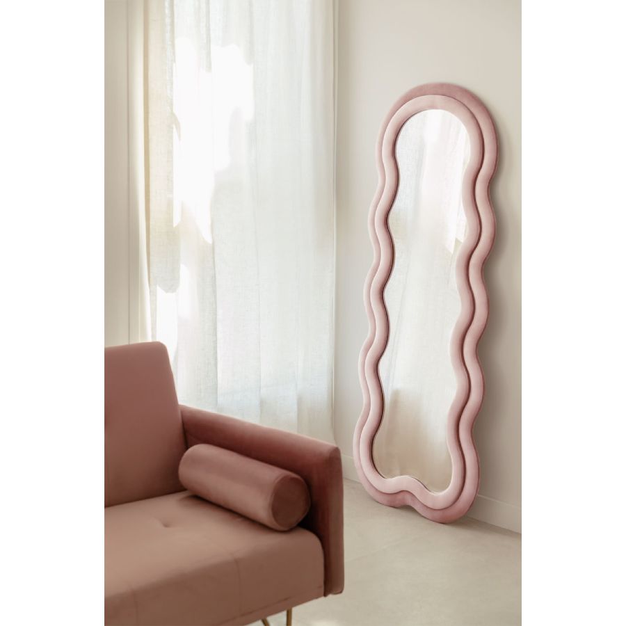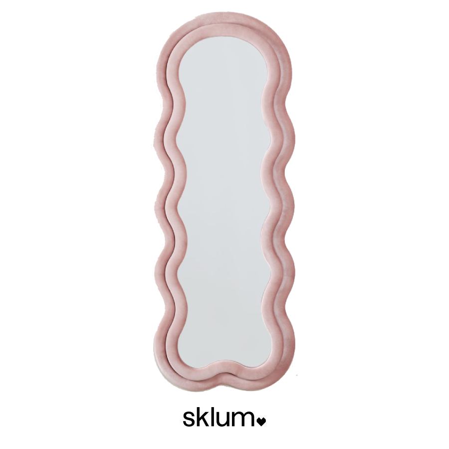 Transforma tus espacios con este original espejo tapizado en suave terciopelo y espuma. Su diseño ondulado aporta luz y amplitud, es ideal para vestidores o recibidores con estilo moderno.