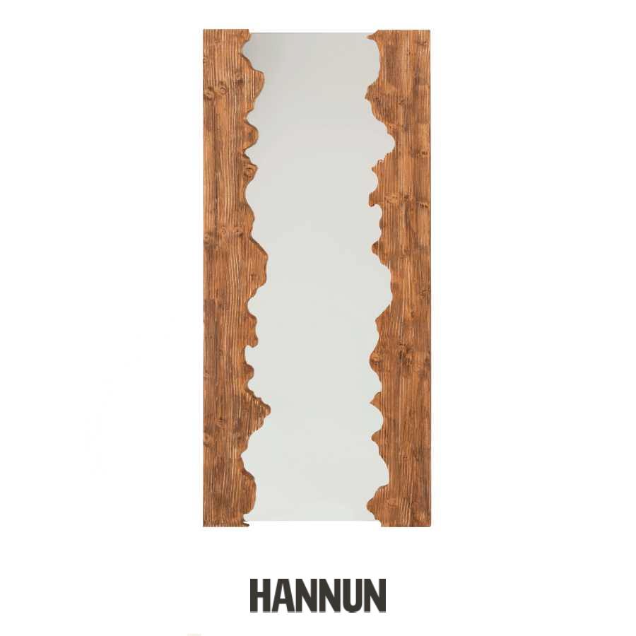 Original espejo rectangular de pie de estilo rústico. Hecho de madera con formas irregulares y asimétricas. Fabricado artesanalmente a partir de dos piezas alistonadas de madera de abeto tratadas para dar un aspecto desgastado.