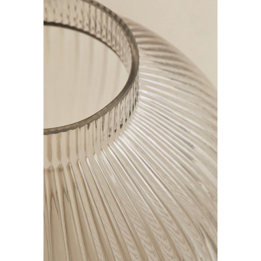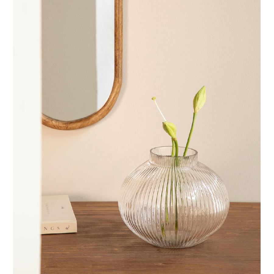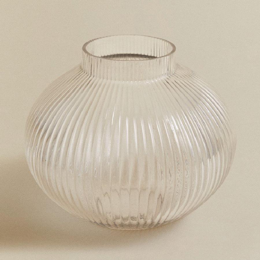 Precioso jarrón de vidrio transparente con diseño redondeado y acabado texturizado con líneas verticales en relieve.