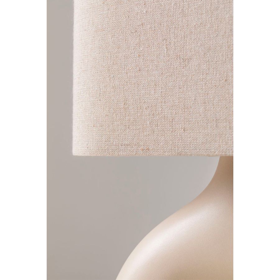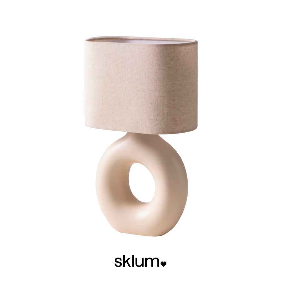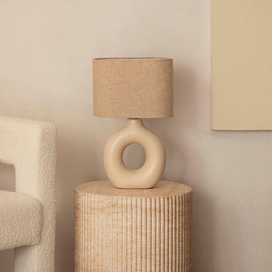 Coqueta lámpara de mesa con base de cerámica y pantalla de lino que aportará calidez y naturalidad a tu estancia.